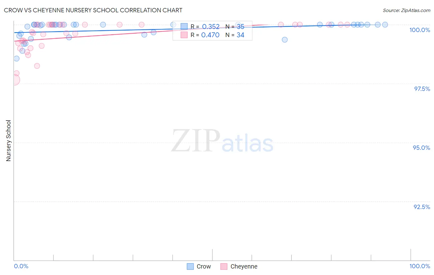 The statistical analysis conducted on geographies consisting of 665,246 people shows a mild positive correlation between the proportion of Crow and percentage of population with at least nursery school education in the United States with a correlation coefficient (R) of 0.352 and weighted average of 99.7%. Similarly, the statistical analysis conducted on geographies consisting of 80,719,411 people shows a moderate positive correlation between the proportion of Cheyenne and percentage of population with at least nursery school education in the United States with a correlation coefficient (R) of 0.470 and weighted average of 98.4%, a difference of 1.3%.