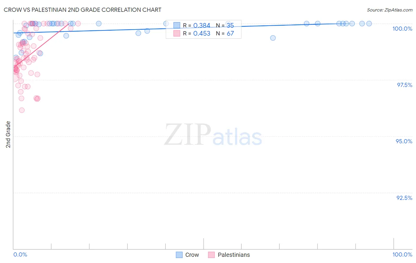 In terms of 2nd grade, the demographic groups most similar to Crow are Yup'ik (99.2%, a difference of 0.49%), Inupiat (98.8%, a difference of 0.81%), Tsimshian (98.8%, a difference of 0.85%), Alaskan Athabascan (98.7%, a difference of 0.92%), and Alaska Native (98.7%, a difference of 0.97%).