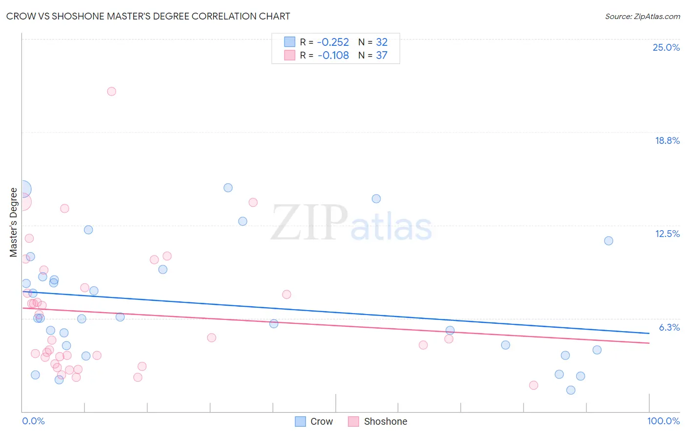 The statistical analysis conducted on geographies consisting of 59,200,277 people shows a weak negative correlation between the proportion of Crow and percentage of population with at least master's degree education in the United States with a correlation coefficient (R) of -0.252 and weighted average of 10.6%. Similarly, the statistical analysis conducted on geographies consisting of 66,620,223 people shows a poor negative correlation between the proportion of Shoshone and percentage of population with at least master's degree education in the United States with a correlation coefficient (R) of -0.108 and weighted average of 11.1%, a difference of 4.4%.