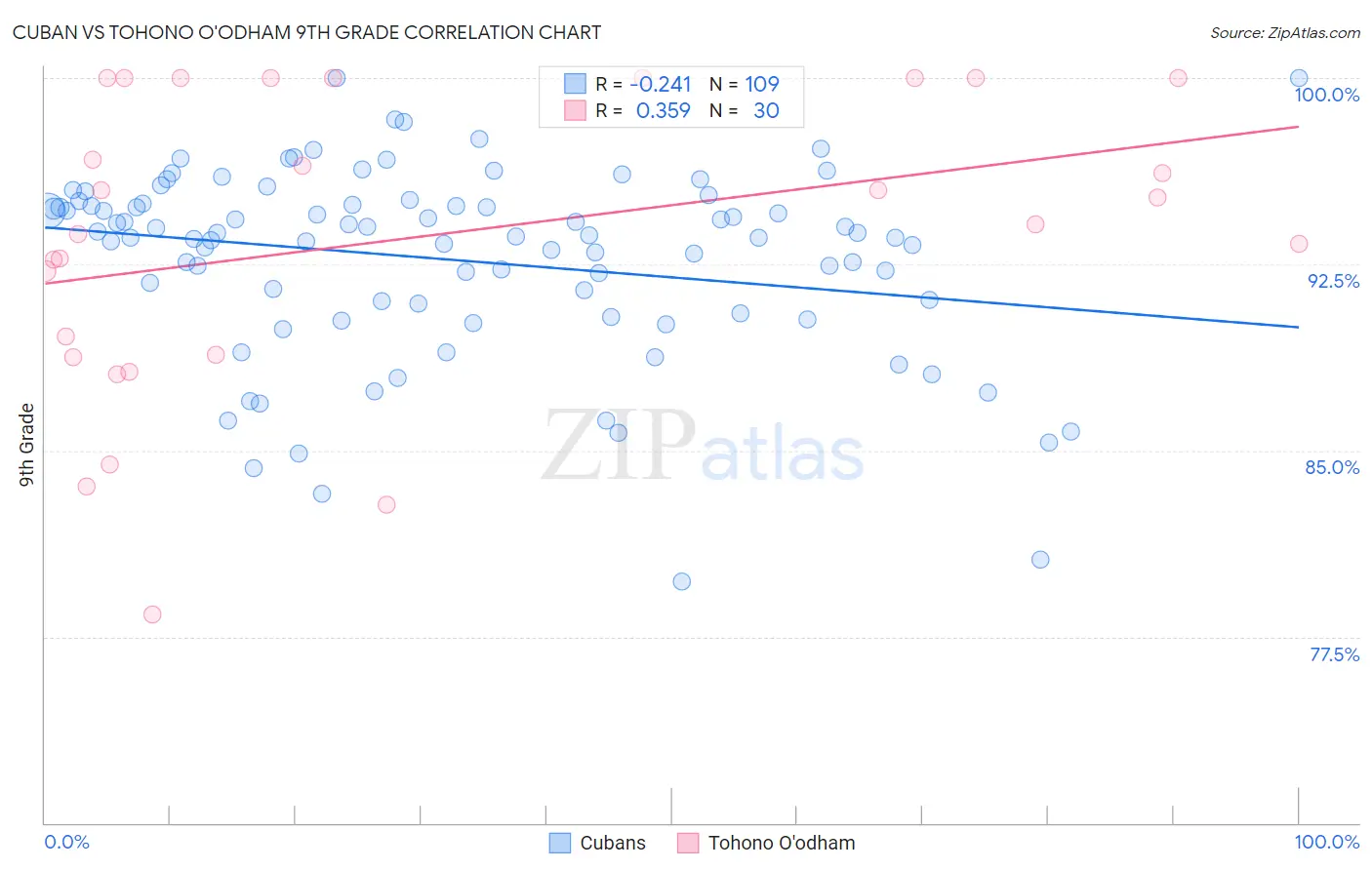 In terms of 9th grade, the demographic groups most similar to Cubans are Sri Lankan (93.2%, a difference of 0.0%), Immigrants from Laos (93.2%, a difference of 0.020%), Immigrants from Burma/Myanmar (93.1%, a difference of 0.020%), Indonesian (93.1%, a difference of 0.020%), and British West Indian (93.2%, a difference of 0.030%). Similarly, the demographic groups most similar to Tohono O'odham are Guyanese (92.7%, a difference of 0.020%), Japanese (92.6%, a difference of 0.020%), Immigrants from Vietnam (92.6%, a difference of 0.020%), Immigrants from Dominica (92.7%, a difference of 0.040%), and Immigrants from Haiti (92.7%, a difference of 0.12%).