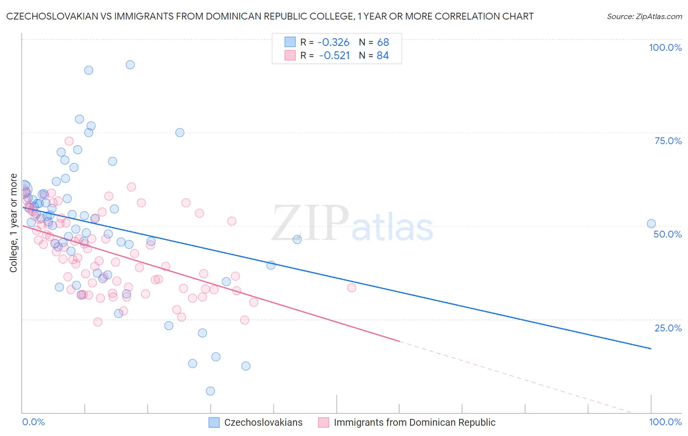 Czechoslovakian vs Immigrants from Dominican Republic College, 1 year or more Correlation Chart