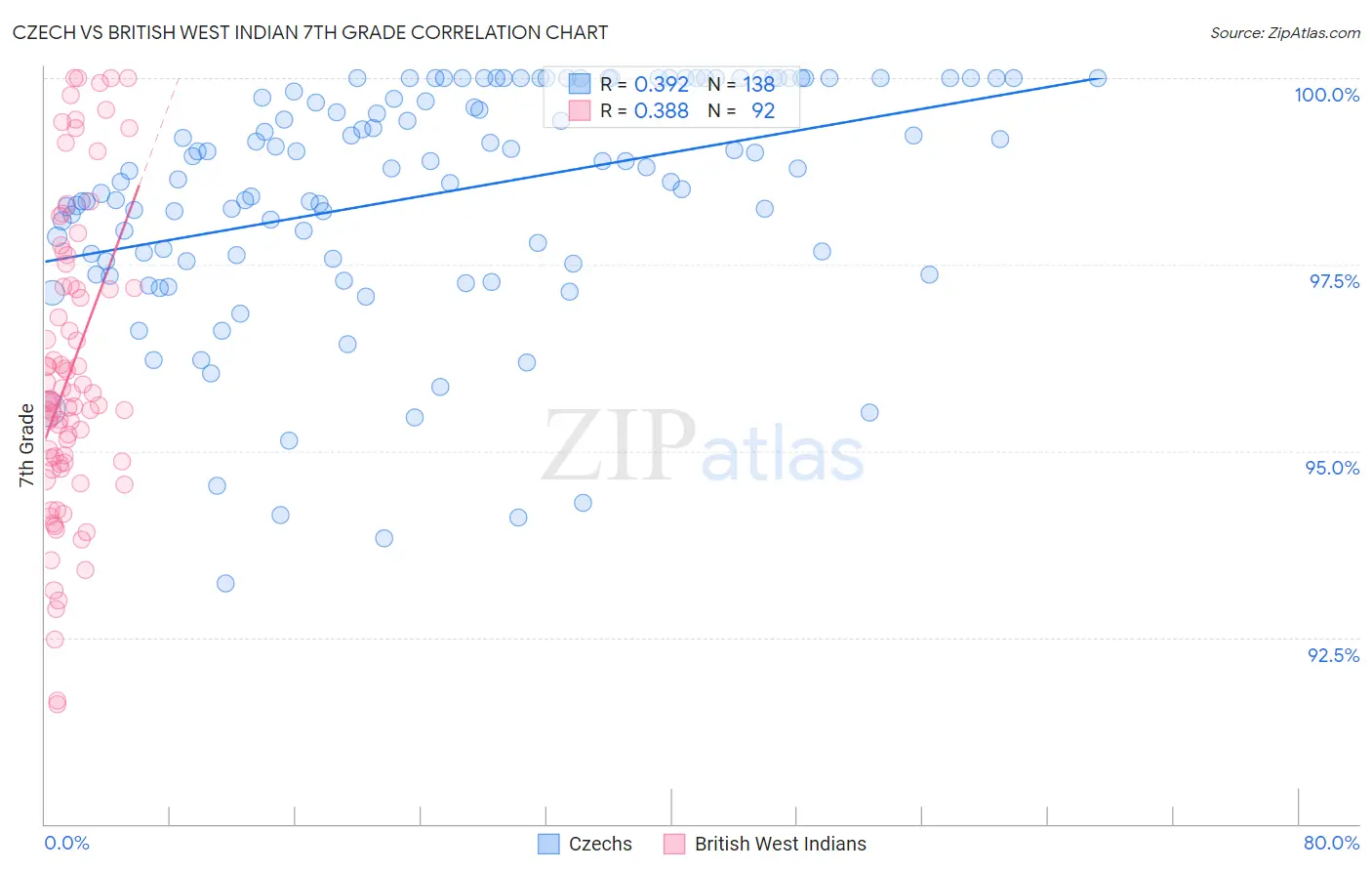 The statistical analysis conducted on geographies consisting of 484,805,615 people shows a mild positive correlation between the proportion of Czechs and percentage of population with at least 7th grade education in the United States with a correlation coefficient (R) of 0.392 and weighted average of 97.4%. Similarly, the statistical analysis conducted on geographies consisting of 152,691,173 people shows a mild positive correlation between the proportion of British West Indians and percentage of population with at least 7th grade education in the United States with a correlation coefficient (R) of 0.388 and weighted average of 94.8%, a difference of 2.6%.