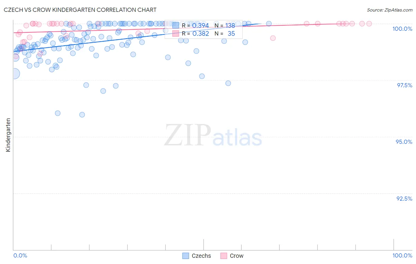 In terms of kindergarten, the demographic groups most similar to Czechs are European (98.6%, a difference of 0.0%), French Canadian (98.6%, a difference of 0.0%), Croatian (98.6%, a difference of 0.010%), French (98.6%, a difference of 0.010%), and Scandinavian (98.6%, a difference of 0.010%).