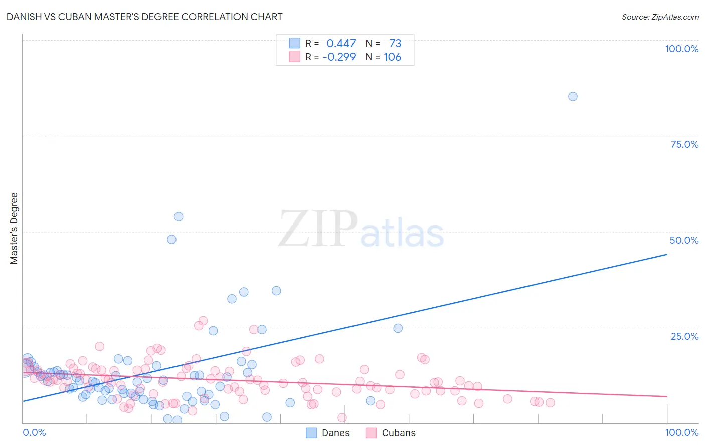 The statistical analysis conducted on geographies consisting of 473,923,988 people shows a moderate positive correlation between the proportion of Danes and percentage of population with at least master's degree education in the United States with a correlation coefficient (R) of 0.447 and weighted average of 14.5%. Similarly, the statistical analysis conducted on geographies consisting of 449,063,887 people shows a weak negative correlation between the proportion of Cubans and percentage of population with at least master's degree education in the United States with a correlation coefficient (R) of -0.299 and weighted average of 12.1%, a difference of 20.5%.