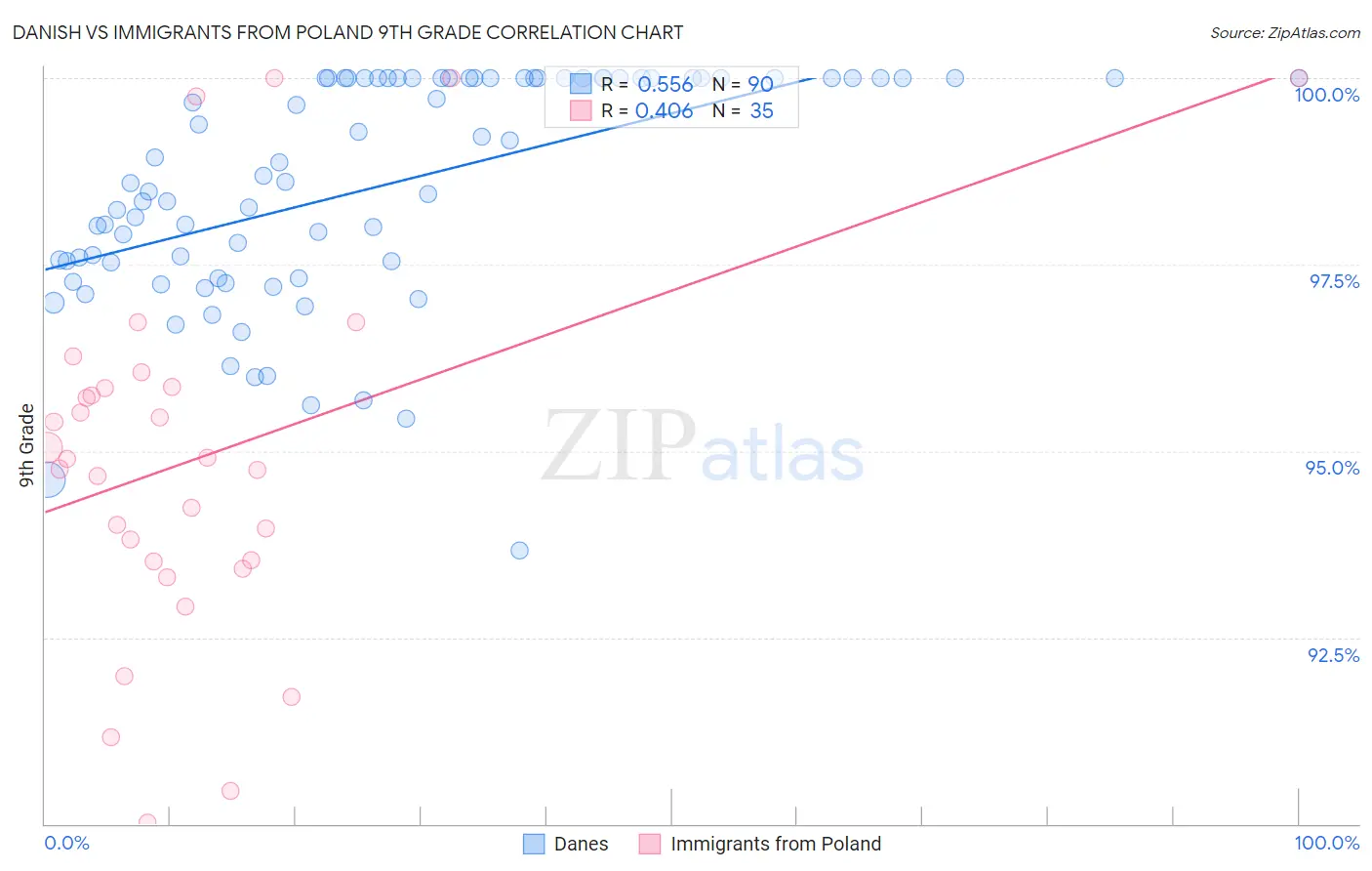 Danish vs Immigrants from Poland 9th Grade Correlation Chart