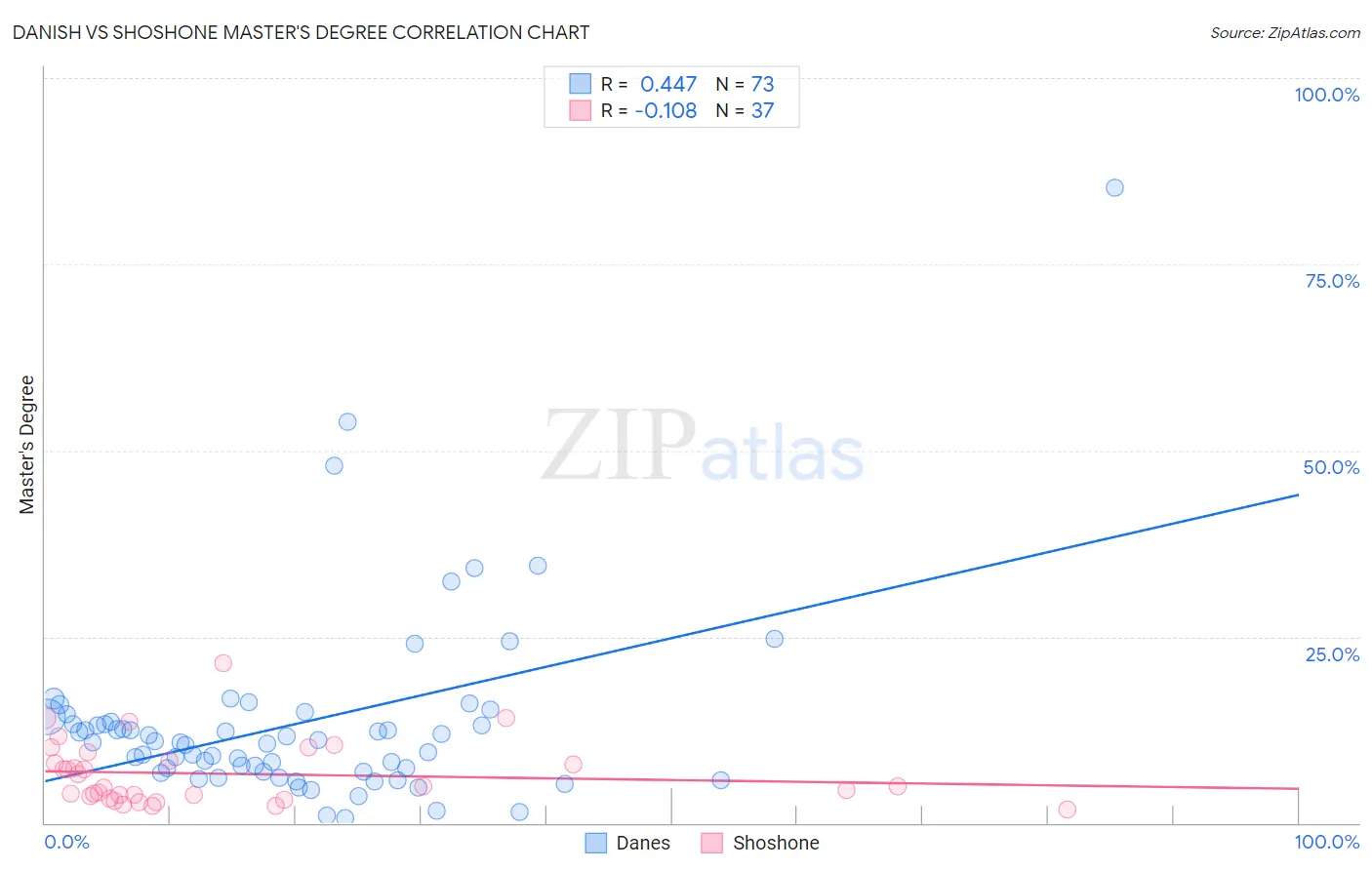 The statistical analysis conducted on geographies consisting of 473,923,988 people shows a moderate positive correlation between the proportion of Danes and percentage of population with at least master's degree education in the United States with a correlation coefficient (R) of 0.447 and weighted average of 14.5%. Similarly, the statistical analysis conducted on geographies consisting of 66,620,223 people shows a poor negative correlation between the proportion of Shoshone and percentage of population with at least master's degree education in the United States with a correlation coefficient (R) of -0.108 and weighted average of 11.1%, a difference of 31.1%.