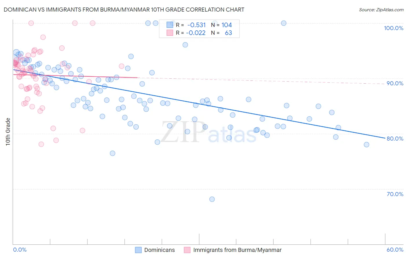 Dominican vs Immigrants from Burma/Myanmar 10th Grade Correlation Chart