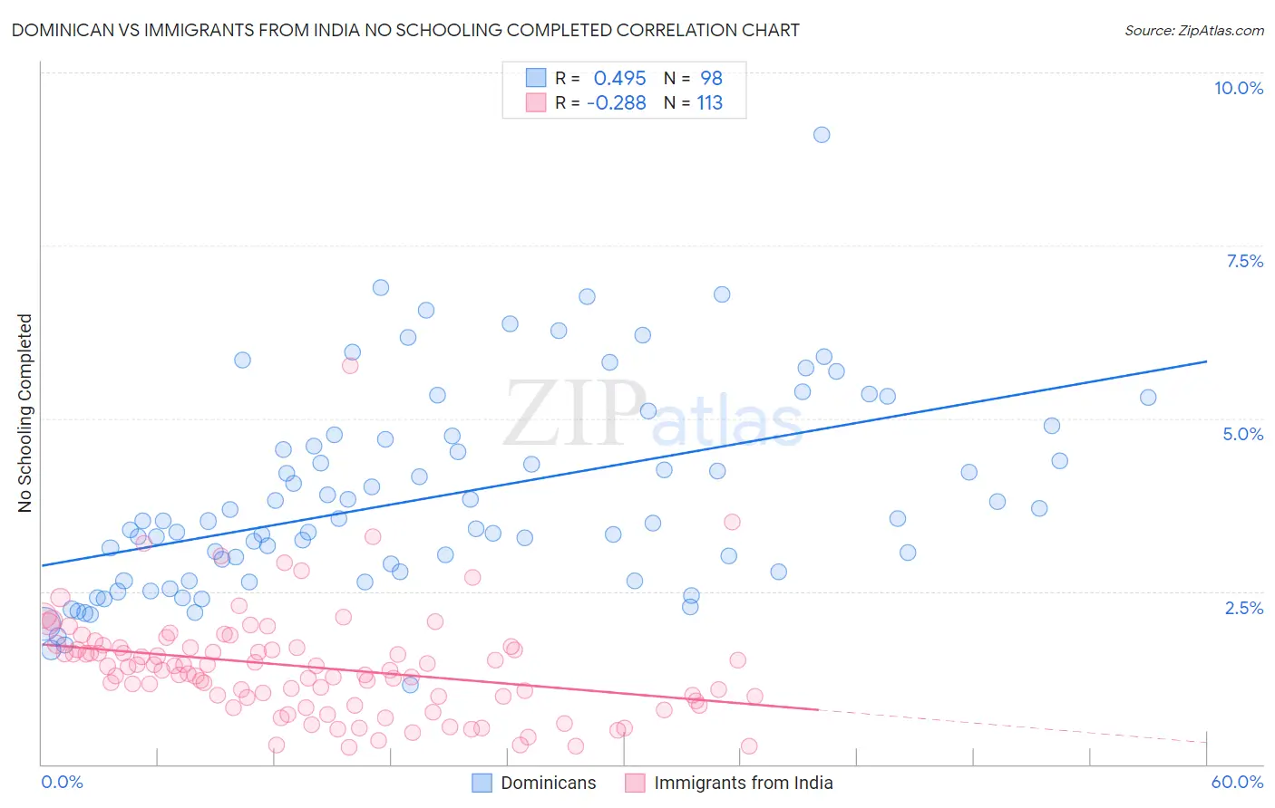 Dominican vs Immigrants from India No Schooling Completed Correlation Chart