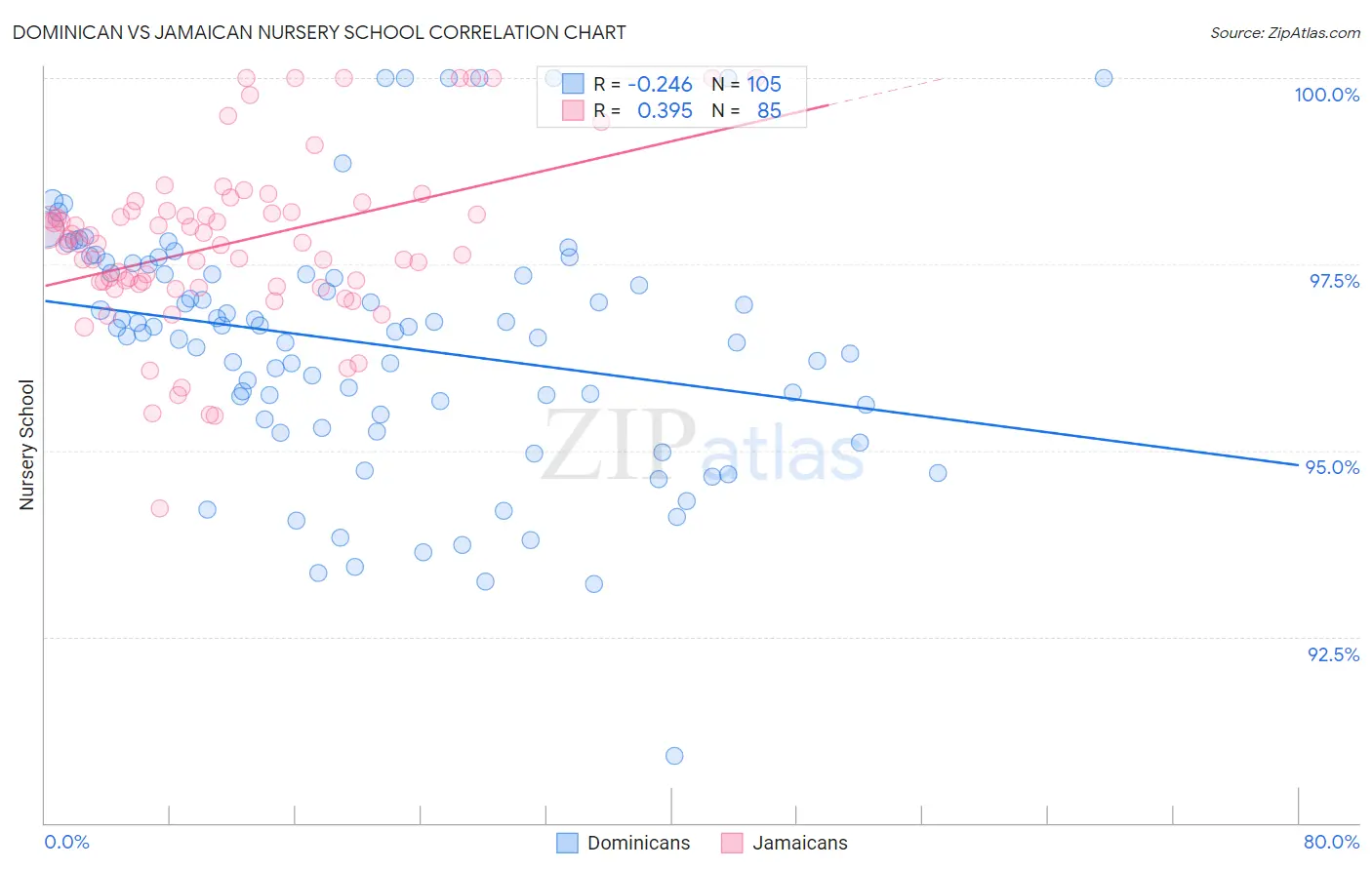 The statistical analysis conducted on geographies consisting of 355,142,603 people shows a weak negative correlation between the proportion of Dominicans and percentage of population with at least nursery school education in the United States with a correlation coefficient (R) of -0.246 and weighted average of 96.8%. Similarly, the statistical analysis conducted on geographies consisting of 368,084,732 people shows a mild positive correlation between the proportion of Jamaicans and percentage of population with at least nursery school education in the United States with a correlation coefficient (R) of 0.395 and weighted average of 97.6%, a difference of 0.82%.