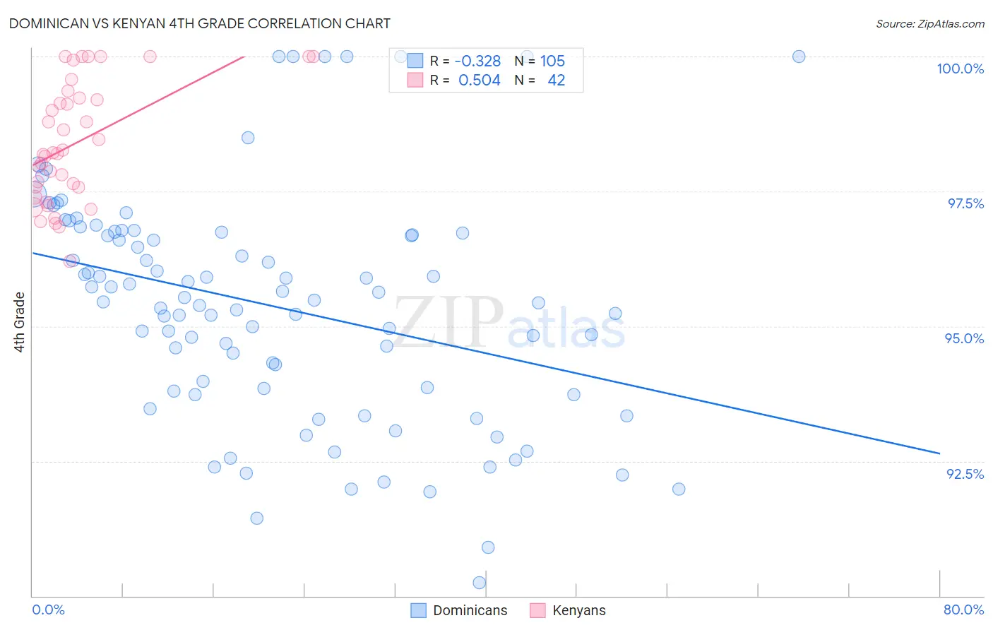 In terms of 4th grade, the demographic groups most similar to Kenyans are Immigrants from Poland (97.5%, a difference of 0.0%), Immigrants from Belarus (97.5%, a difference of 0.0%), Immigrants from Iran (97.6%, a difference of 0.010%), Ugandan (97.6%, a difference of 0.010%), and Venezuelan (97.6%, a difference of 0.010%).