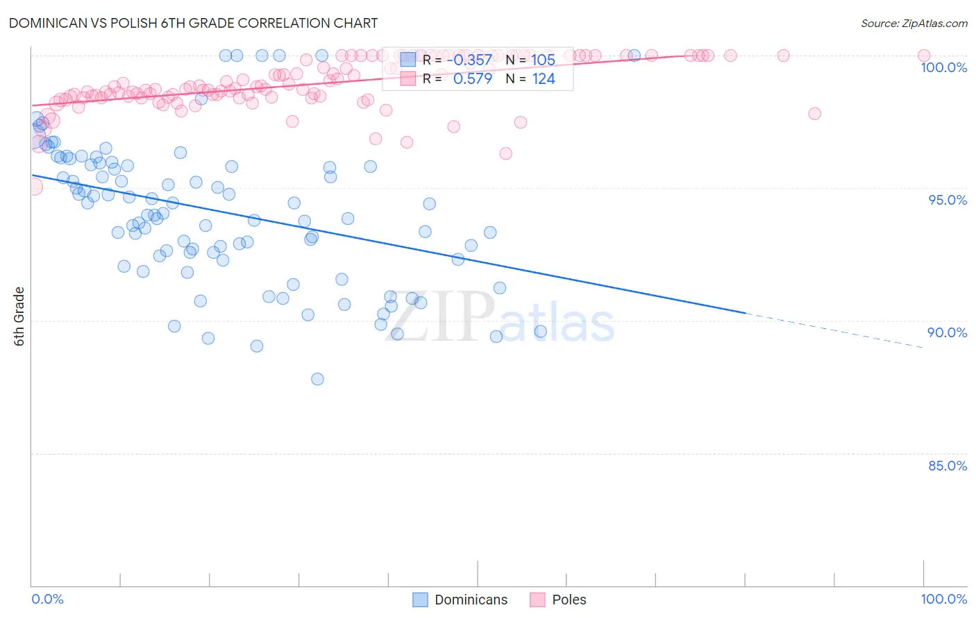 The statistical analysis conducted on geographies consisting of 355,142,603 people shows a mild negative correlation between the proportion of Dominicans and percentage of population with at least 6th grade education in the United States with a correlation coefficient (R) of -0.357 and weighted average of 94.9%. Similarly, the statistical analysis conducted on geographies consisting of 560,594,514 people shows a substantial positive correlation between the proportion of Poles and percentage of population with at least 6th grade education in the United States with a correlation coefficient (R) of 0.579 and weighted average of 98.1%, a difference of 3.3%.