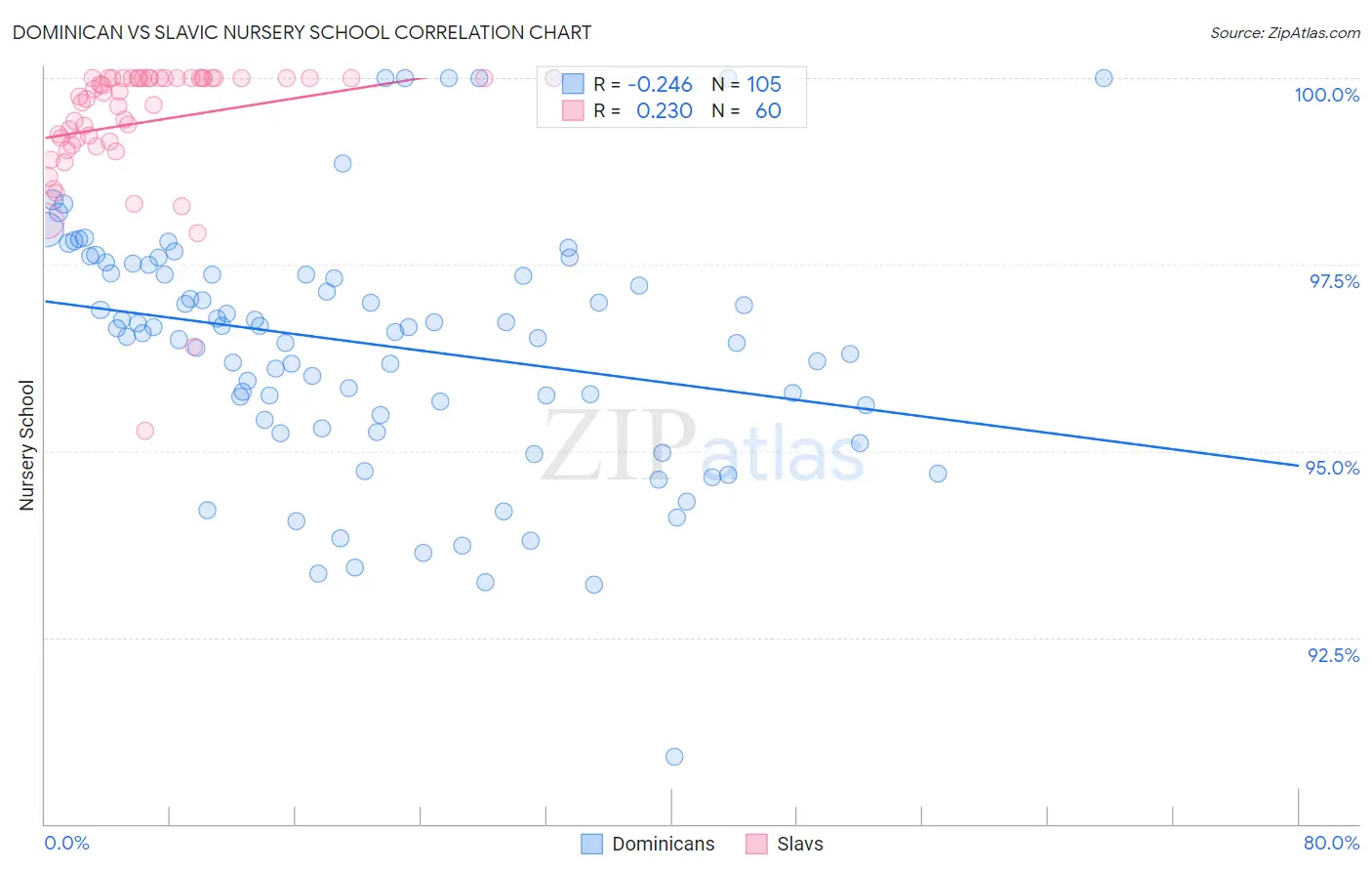The statistical analysis conducted on geographies consisting of 355,142,603 people shows a weak negative correlation between the proportion of Dominicans and percentage of population with at least nursery school education in the United States with a correlation coefficient (R) of -0.246 and weighted average of 96.8%. Similarly, the statistical analysis conducted on geographies consisting of 270,869,056 people shows a weak positive correlation between the proportion of Slavs and percentage of population with at least nursery school education in the United States with a correlation coefficient (R) of 0.230 and weighted average of 98.4%, a difference of 1.7%.