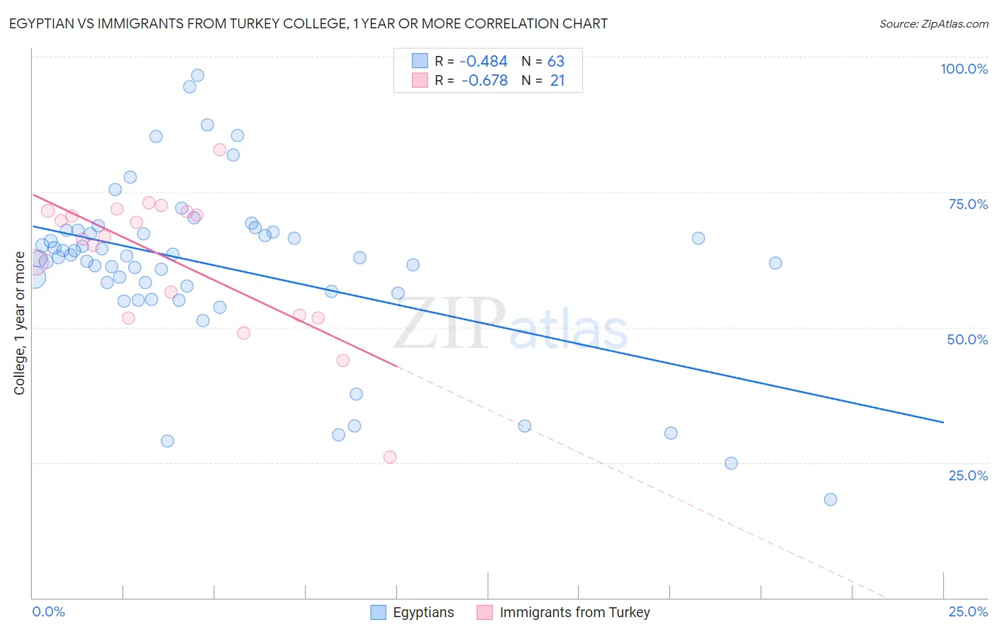 Egyptian vs Immigrants from Turkey College, 1 year or more Correlation Chart