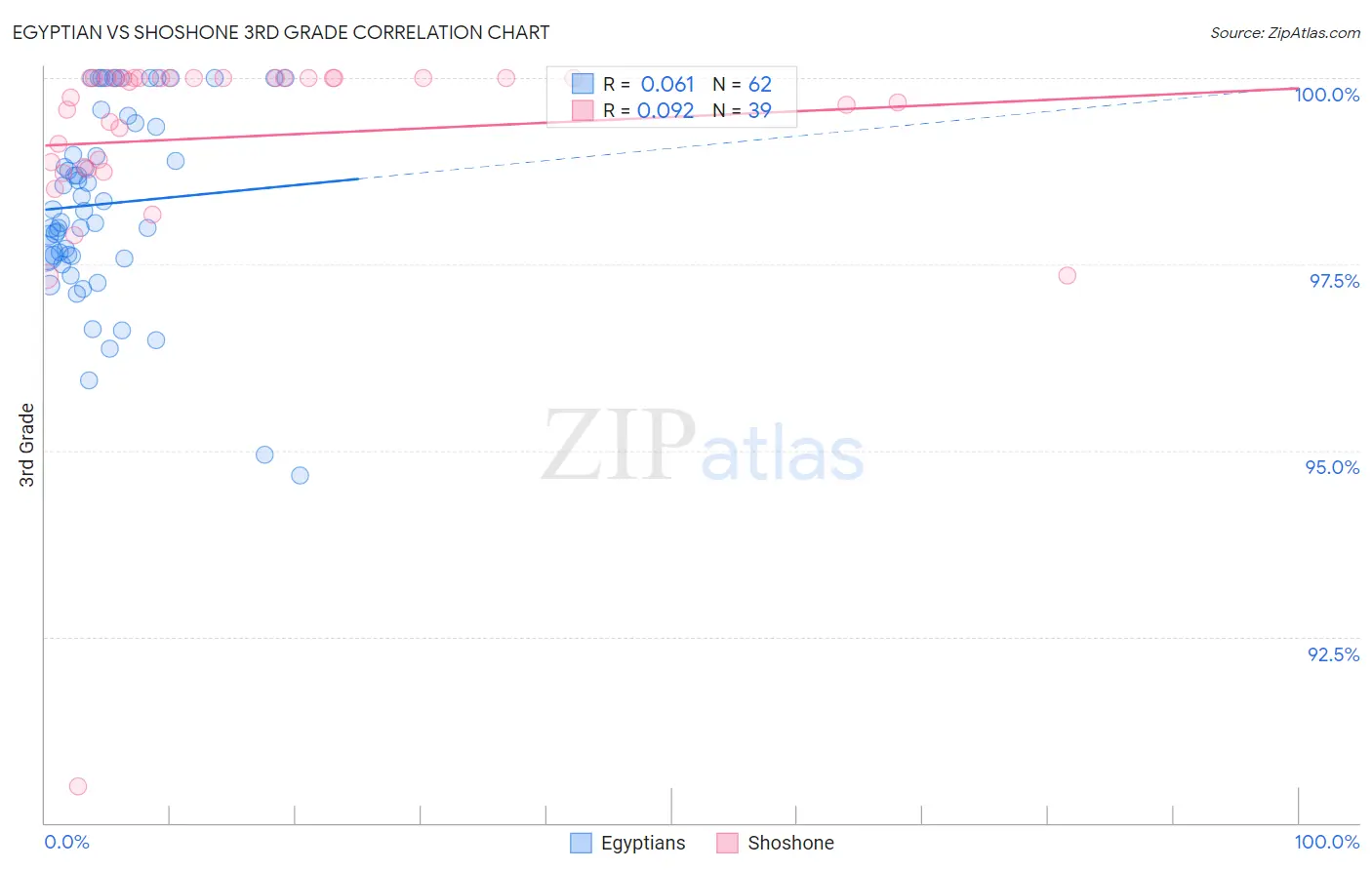 The statistical analysis conducted on geographies consisting of 276,927,423 people shows a slight positive correlation between the proportion of Egyptians and percentage of population with at least 3rd grade education in the United States with a correlation coefficient (R) of 0.061 and weighted average of 97.7%. Similarly, the statistical analysis conducted on geographies consisting of 66,625,086 people shows a slight positive correlation between the proportion of Shoshone and percentage of population with at least 3rd grade education in the United States with a correlation coefficient (R) of 0.092 and weighted average of 98.1%, a difference of 0.40%.