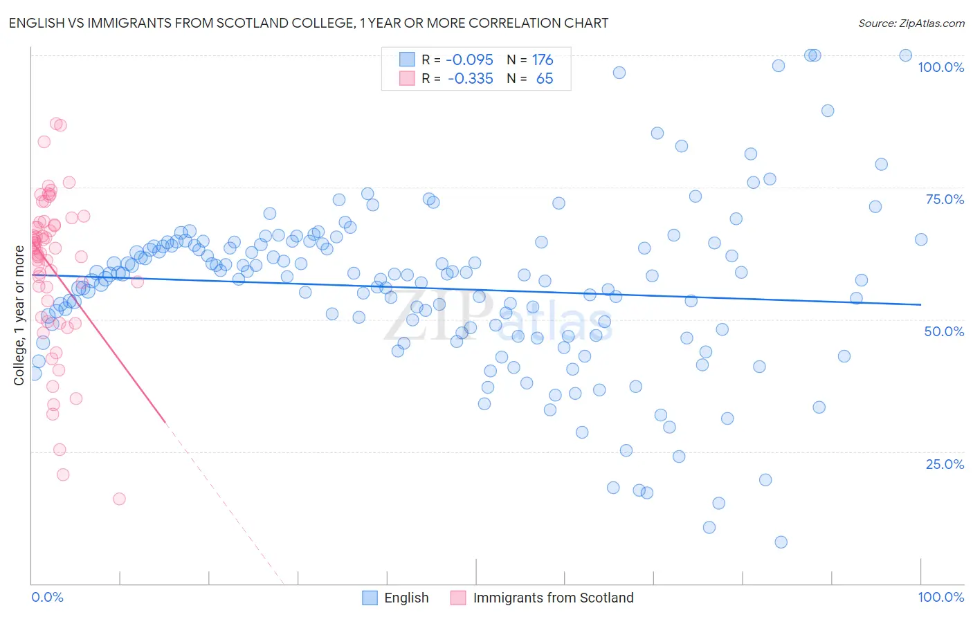 English vs Immigrants from Scotland College, 1 year or more Correlation Chart