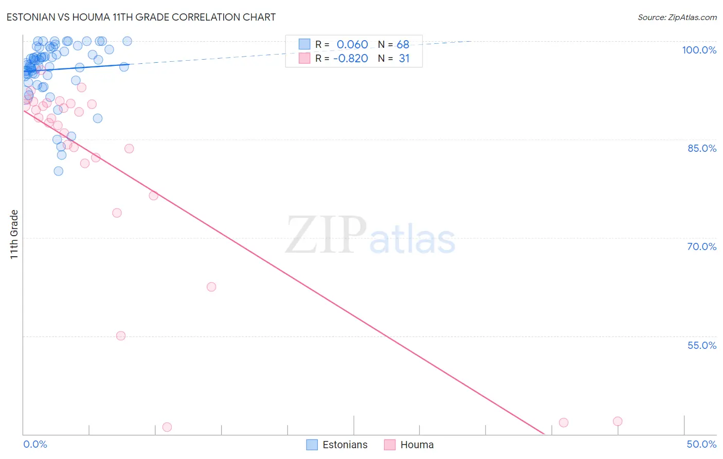 The statistical analysis conducted on geographies consisting of 123,528,404 people shows a slight positive correlation between the proportion of Estonians and percentage of population with at least 11th grade education in the United States with a correlation coefficient (R) of 0.060 and weighted average of 94.4%. Similarly, the statistical analysis conducted on geographies consisting of 36,795,916 people shows a very strong negative correlation between the proportion of Houma and percentage of population with at least 11th grade education in the United States with a correlation coefficient (R) of -0.820 and weighted average of 87.0%, a difference of 8.4%.