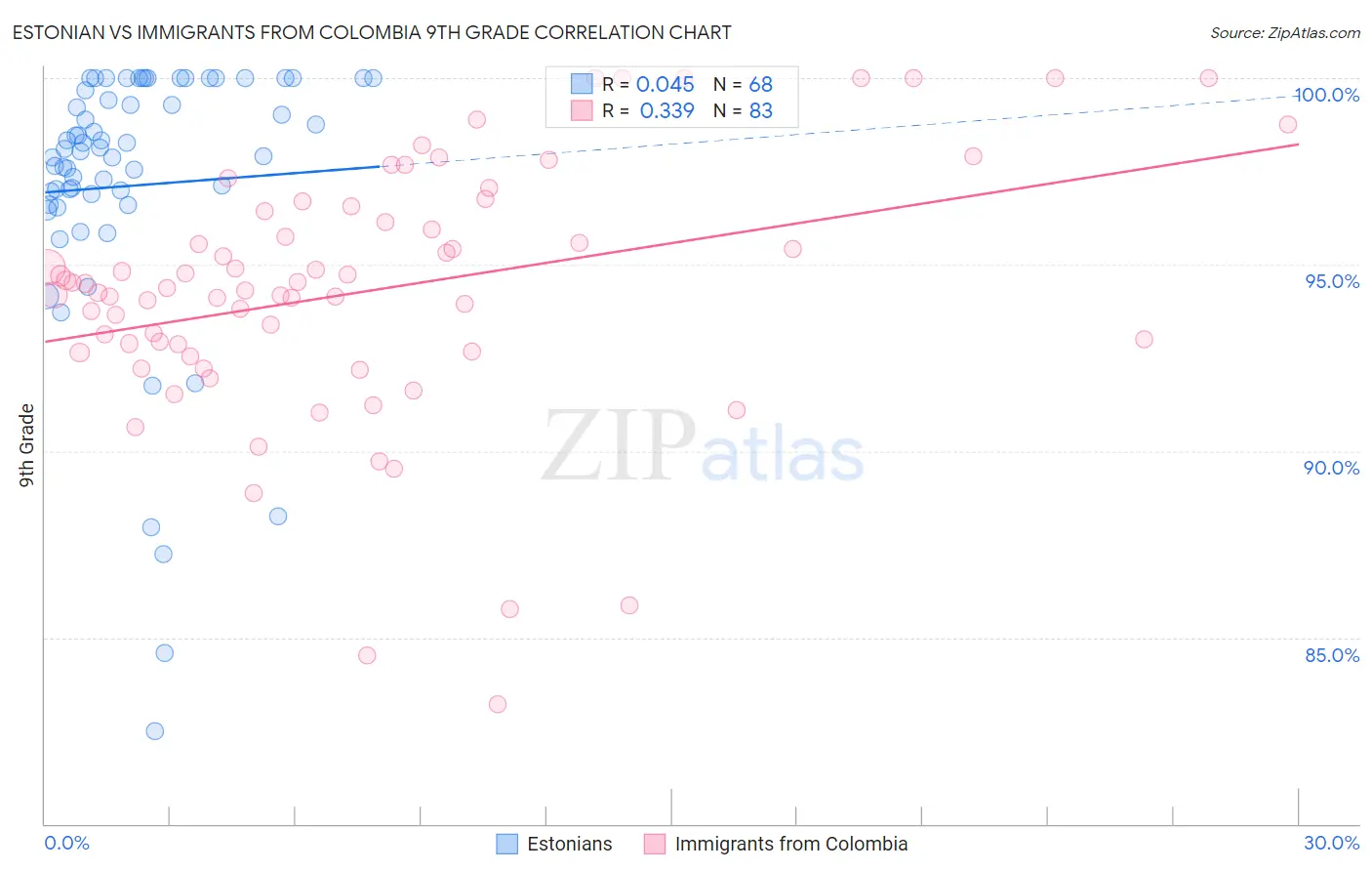 Estonian vs Immigrants from Colombia 9th Grade Correlation Chart