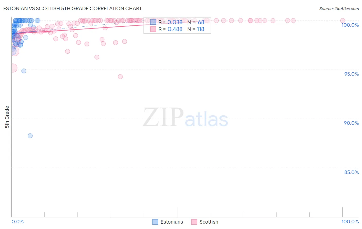In terms of 5th grade, the demographic groups most similar to Estonians are Immigrants from Scotland (98.0%, a difference of 0.0%), Celtic (98.0%, a difference of 0.0%), Bulgarian (98.0%, a difference of 0.010%), Maltese (98.0%, a difference of 0.010%), and Slavic (98.0%, a difference of 0.010%).