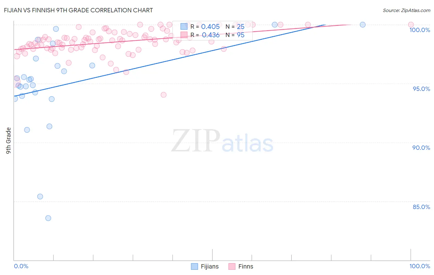 The statistical analysis conducted on geographies consisting of 55,948,842 people shows a moderate positive correlation between the proportion of Fijians and percentage of population with at least 9th grade education in the United States with a correlation coefficient (R) of 0.405 and weighted average of 93.1%. Similarly, the statistical analysis conducted on geographies consisting of 404,676,377 people shows a moderate positive correlation between the proportion of Finns and percentage of population with at least 9th grade education in the United States with a correlation coefficient (R) of 0.436 and weighted average of 96.6%, a difference of 3.7%.