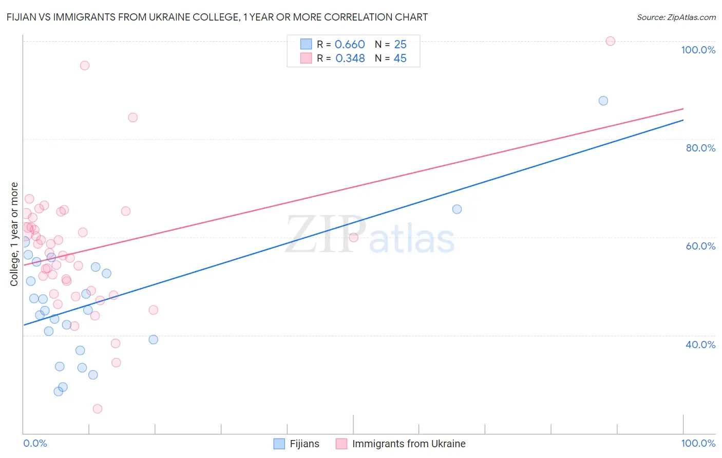 Fijian vs Immigrants from Ukraine College, 1 year or more Correlation Chart