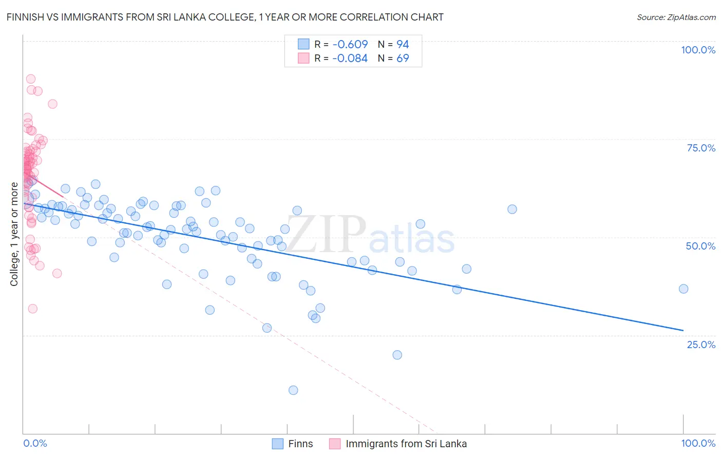 Finnish vs Immigrants from Sri Lanka College, 1 year or more Correlation Chart