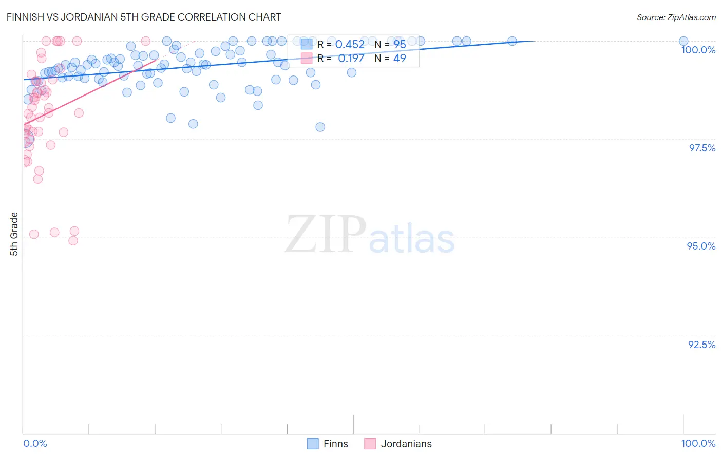 In terms of 5th grade, the demographic groups most similar to Jordanians are Immigrants from Greece (97.5%, a difference of 0.0%), Spaniard (97.5%, a difference of 0.0%), Soviet Union (97.5%, a difference of 0.010%), Israeli (97.5%, a difference of 0.020%), and Immigrants from North Macedonia (97.5%, a difference of 0.020%).