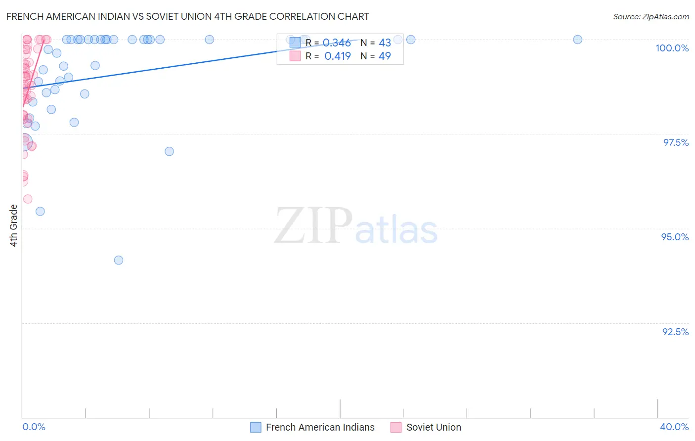 In terms of 4th grade, the demographic groups most similar to French American Indians are Immigrants from Russia (97.6%, a difference of 0.0%), Albanian (97.6%, a difference of 0.0%), Immigrants from Jordan (97.6%, a difference of 0.0%), Immigrants from Bosnia and Herzegovina (97.6%, a difference of 0.0%), and Immigrants from Italy (97.6%, a difference of 0.010%). Similarly, the demographic groups most similar to Soviet Union are Immigrants from Israel (97.6%, a difference of 0.0%), Alsatian (97.6%, a difference of 0.0%), Immigrants from South Central Asia (97.6%, a difference of 0.010%), Jordanian (97.7%, a difference of 0.020%), and Ute (97.7%, a difference of 0.020%).
