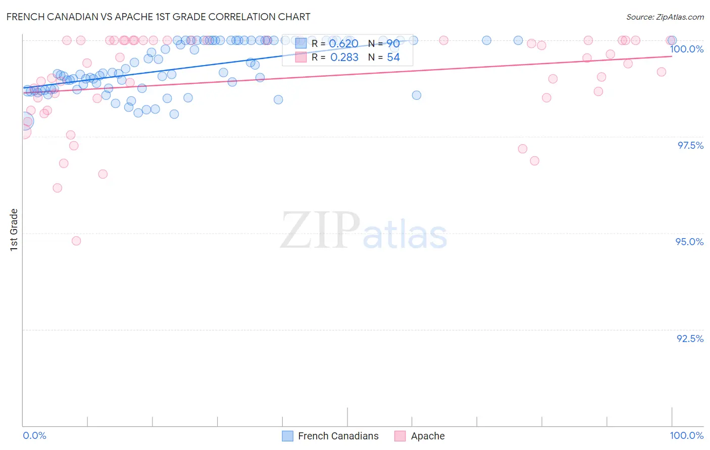 In terms of 1st grade, the demographic groups most similar to French Canadians are European (98.5%, a difference of 0.0%), Czech (98.5%, a difference of 0.0%), Scandinavian (98.5%, a difference of 0.0%), French (98.6%, a difference of 0.010%), and Croatian (98.6%, a difference of 0.020%).