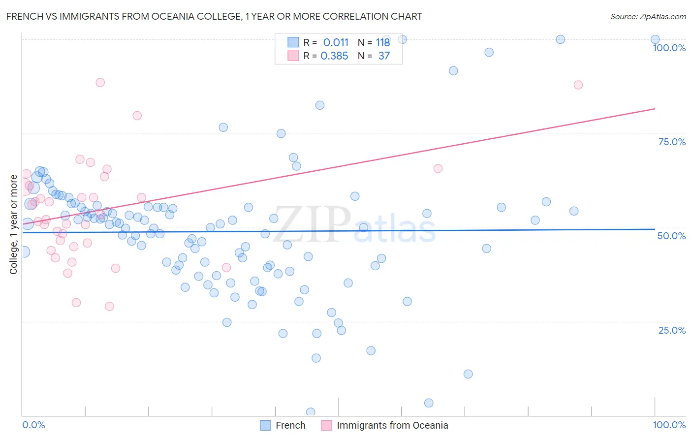 French vs Immigrants from Oceania College, 1 year or more Correlation Chart
