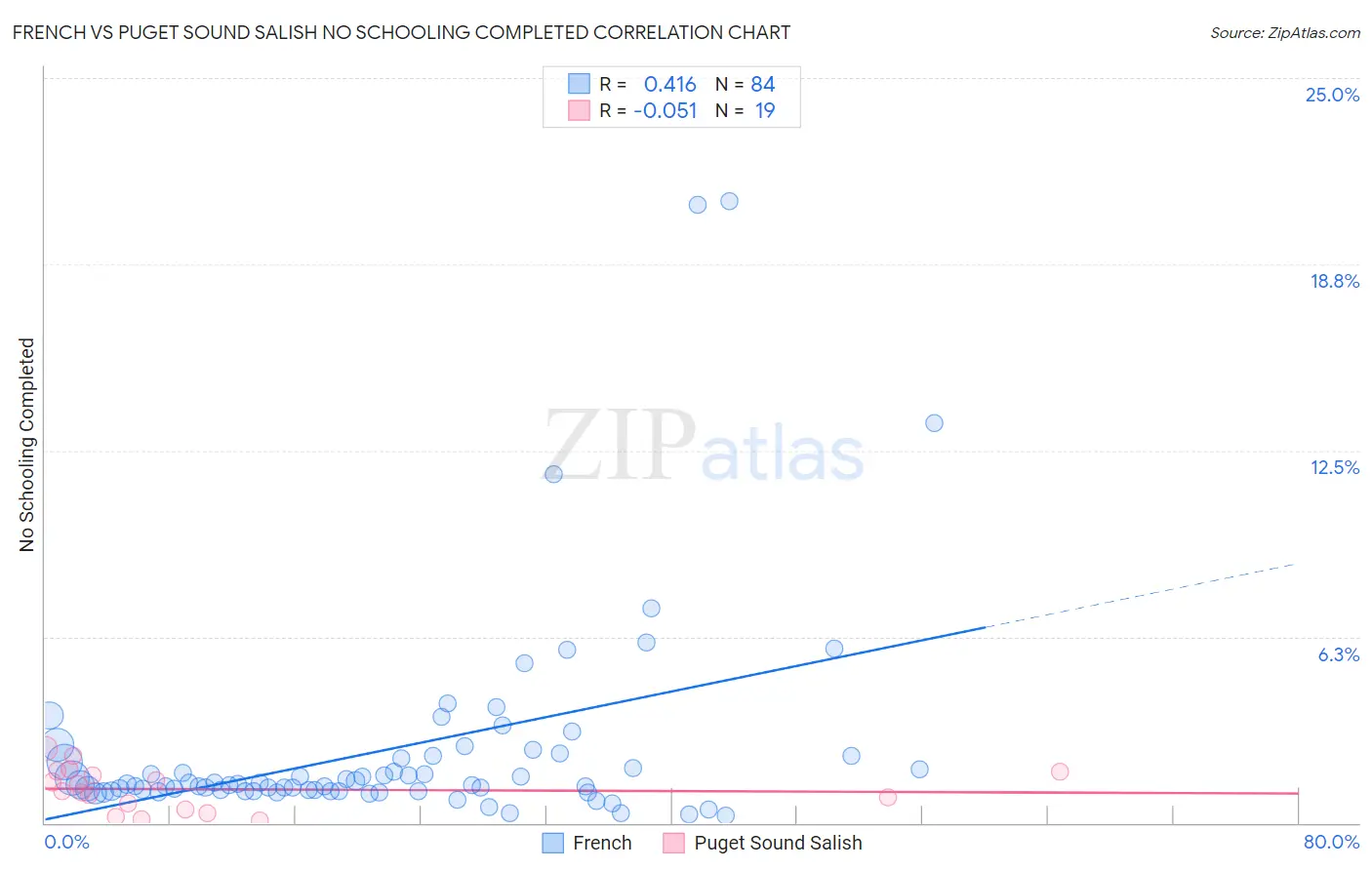French vs Puget Sound Salish No Schooling Completed Correlation Chart