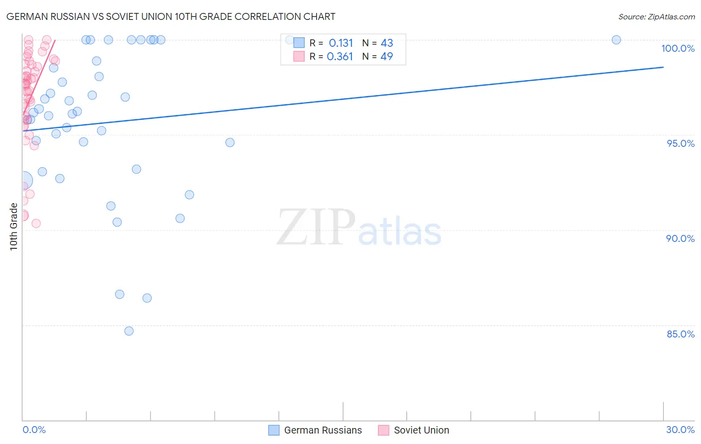 The statistical analysis conducted on geographies consisting of 96,461,984 people shows a poor positive correlation between the proportion of German Russians and percentage of population with at least 10th grade education in the United States with a correlation coefficient (R) of 0.131 and weighted average of 94.4%. Similarly, the statistical analysis conducted on geographies consisting of 43,454,395 people shows a mild positive correlation between the proportion of Soviet Union and percentage of population with at least 10th grade education in the United States with a correlation coefficient (R) of 0.361 and weighted average of 94.6%, a difference of 0.18%.