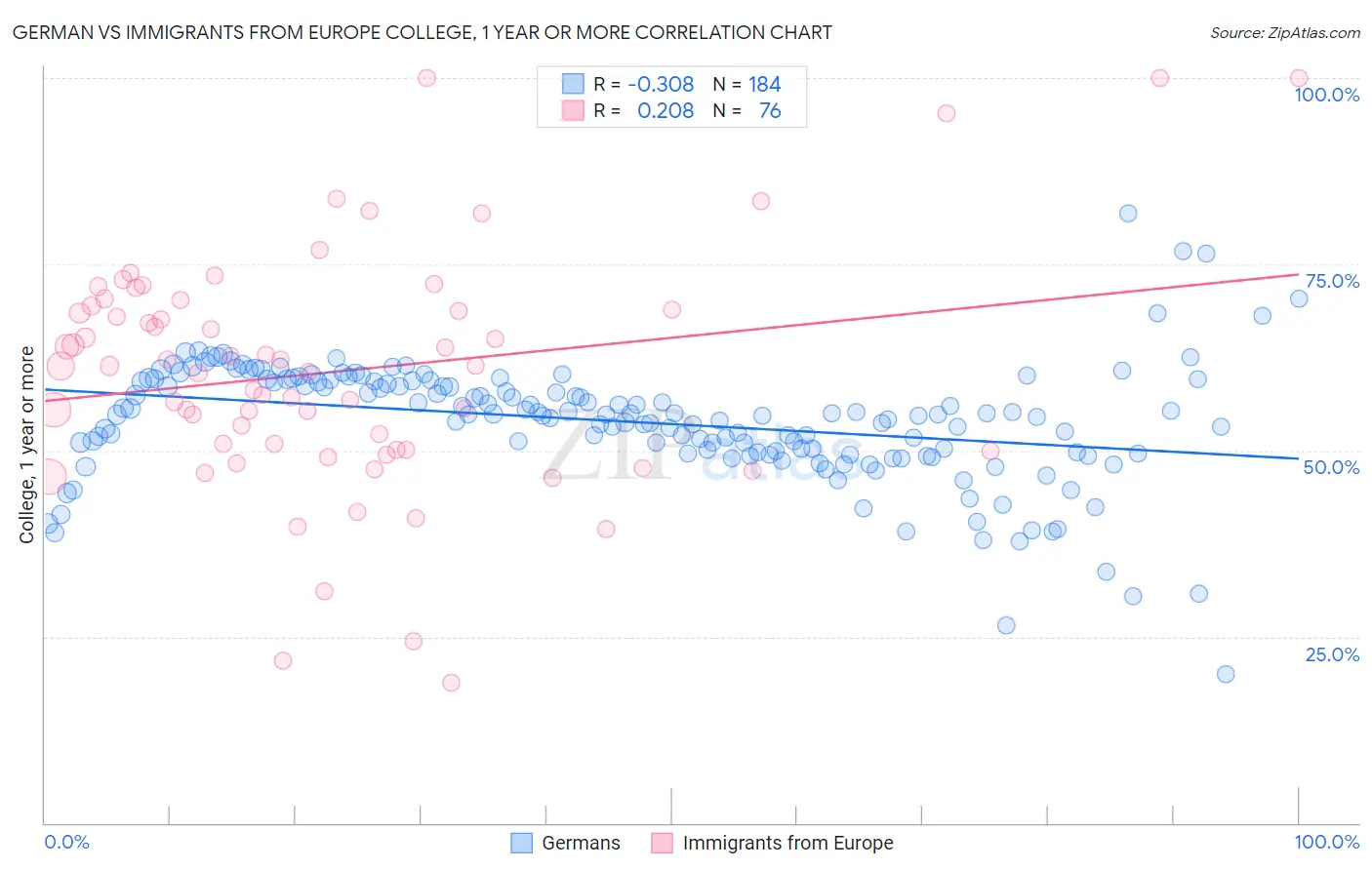 German vs Immigrants from Europe College, 1 year or more Correlation Chart