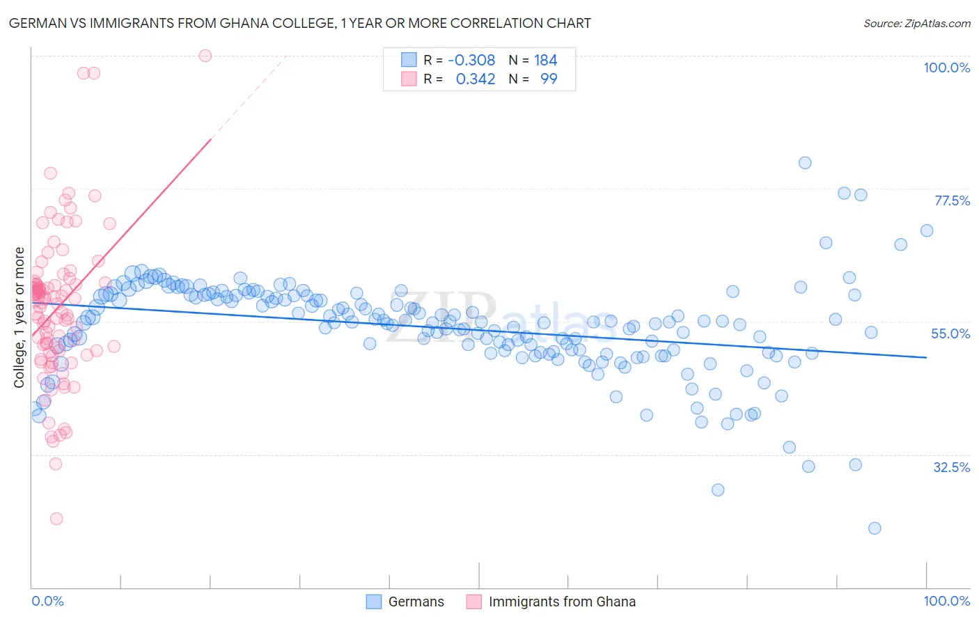 German vs Immigrants from Ghana College, 1 year or more Correlation Chart