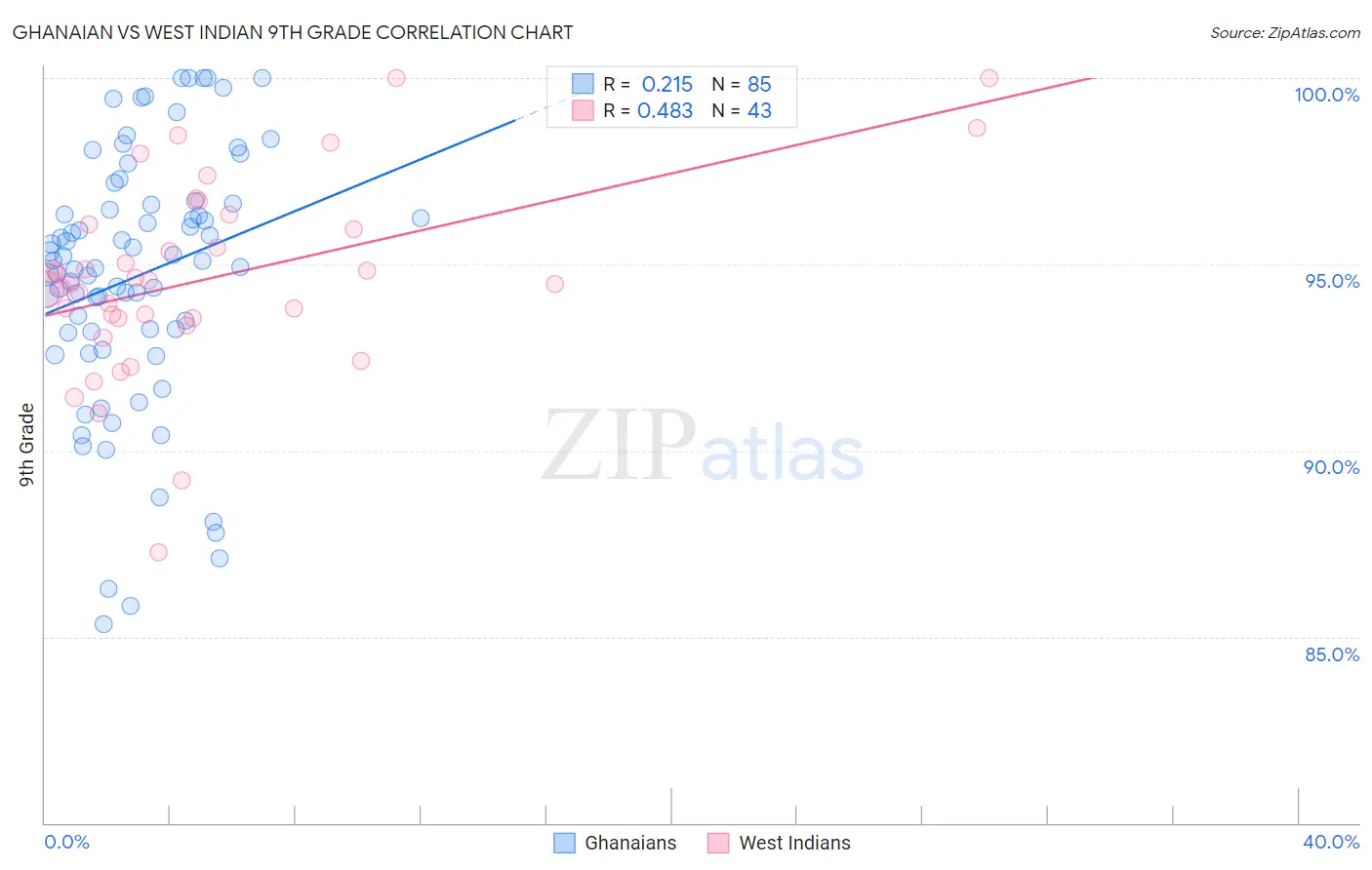 In terms of 9th grade, the demographic groups most similar to Ghanaians are Immigrants from Thailand (93.9%, a difference of 0.0%), Immigrants from Costa Rica (94.0%, a difference of 0.010%), Pima (93.9%, a difference of 0.010%), South American (93.9%, a difference of 0.020%), and Immigrants from Jamaica (93.9%, a difference of 0.040%). Similarly, the demographic groups most similar to West Indians are Immigrants from Philippines (93.7%, a difference of 0.010%), Immigrants from Colombia (93.8%, a difference of 0.020%), Immigrants from South America (93.8%, a difference of 0.030%), Peruvian (93.8%, a difference of 0.030%), and Immigrants from Western Africa (93.8%, a difference of 0.040%).