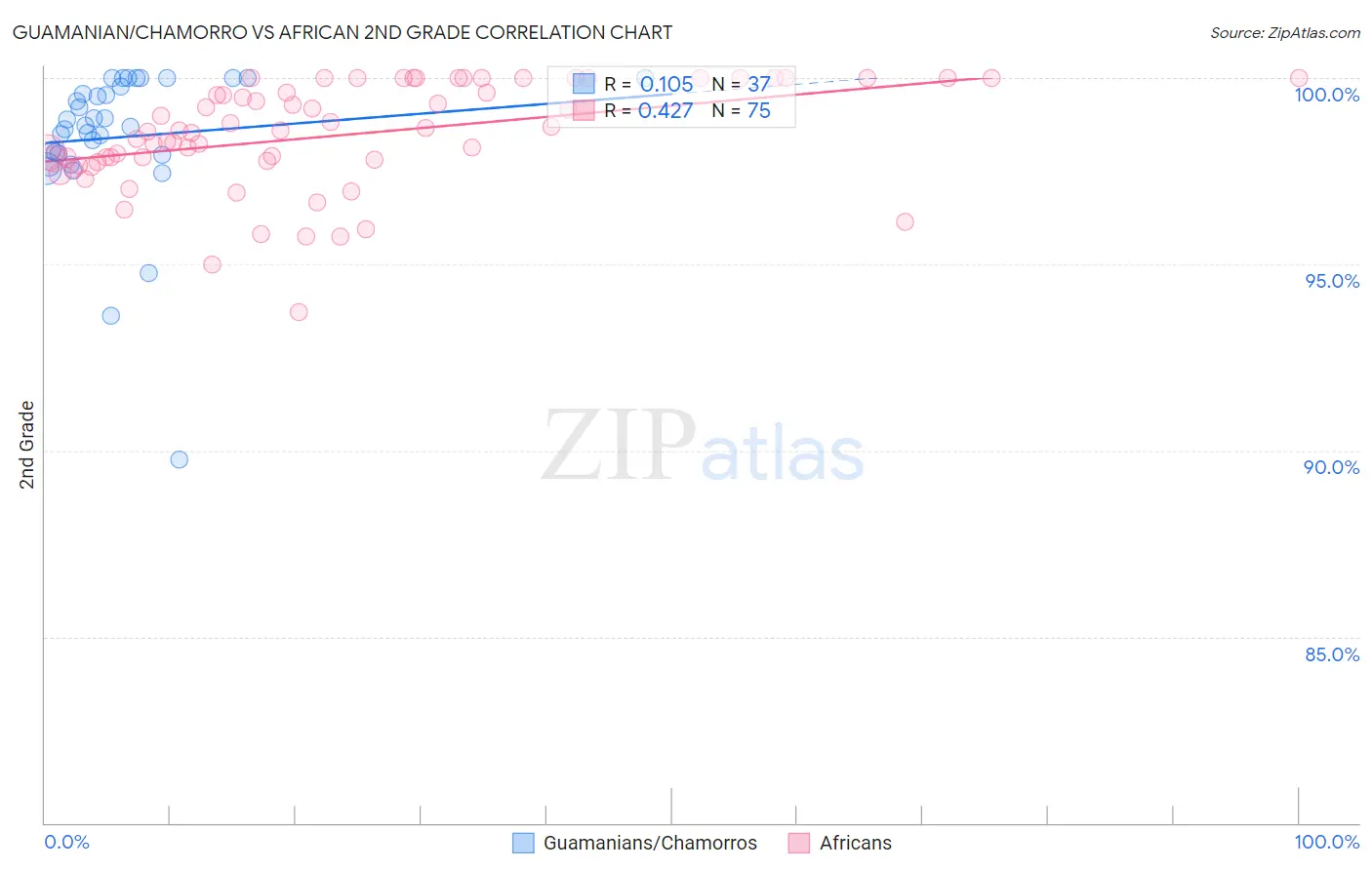 In terms of 2nd grade, the demographic groups most similar to Guamanians/Chamorros are Mongolian (97.8%, a difference of 0.0%), Immigrants from Kenya (97.8%, a difference of 0.0%), Immigrants from Uganda (97.8%, a difference of 0.0%), Hawaiian (97.8%, a difference of 0.010%), and Paiute (97.8%, a difference of 0.010%). Similarly, the demographic groups most similar to Africans are Immigrants from Southern Europe (97.8%, a difference of 0.010%), Immigrants from Chile (97.7%, a difference of 0.010%), Yuman (97.8%, a difference of 0.020%), Immigrants from Albania (97.8%, a difference of 0.020%), and Immigrants from Northern Africa (97.7%, a difference of 0.020%).