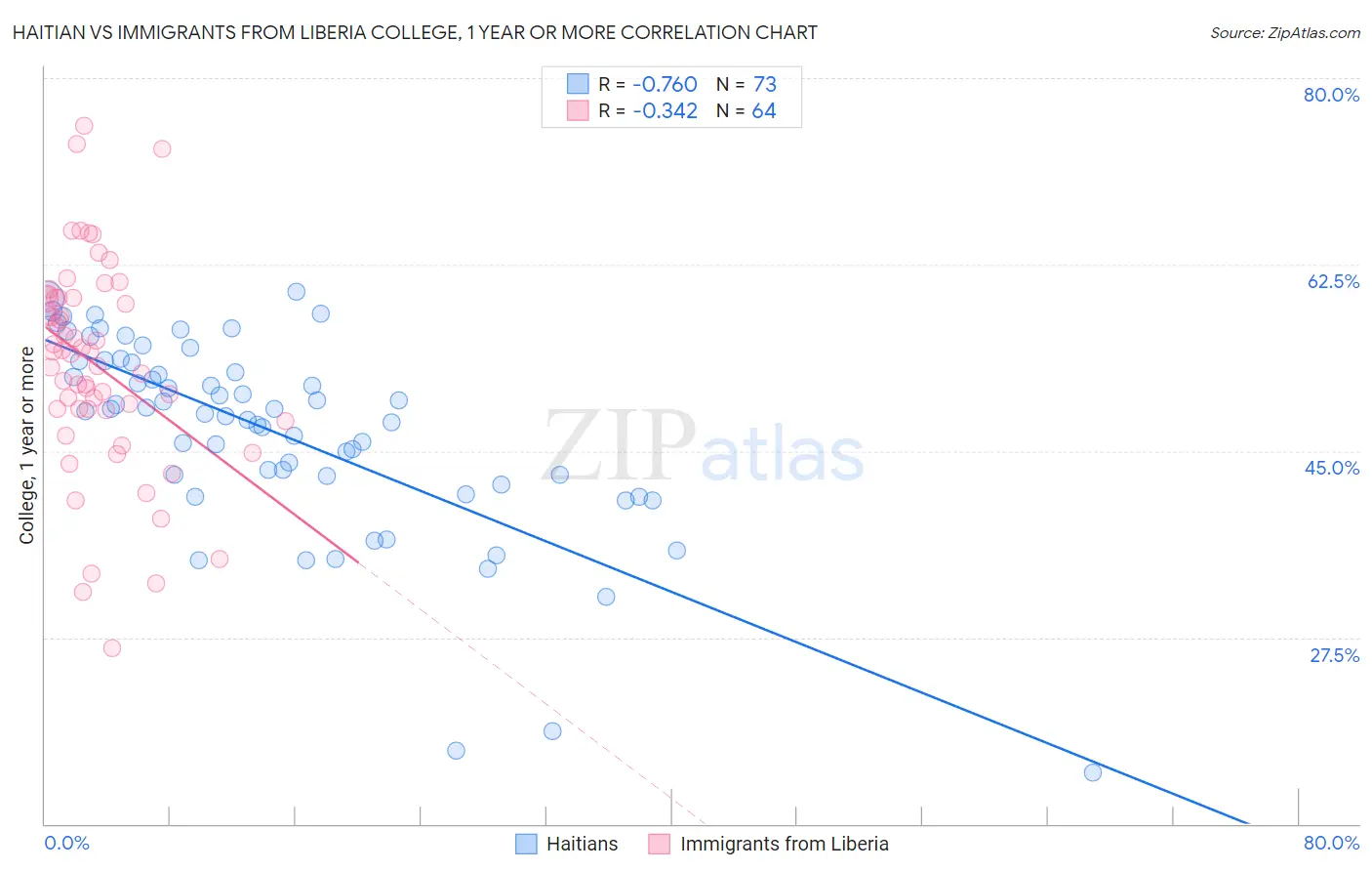 Haitian vs Immigrants from Liberia College, 1 year or more Correlation Chart