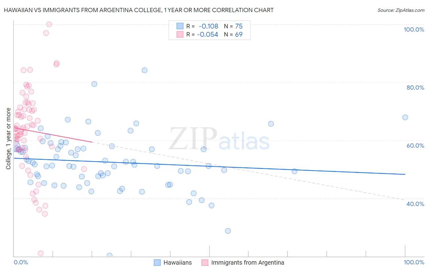 Hawaiian vs Immigrants from Argentina College, 1 year or more Correlation Chart