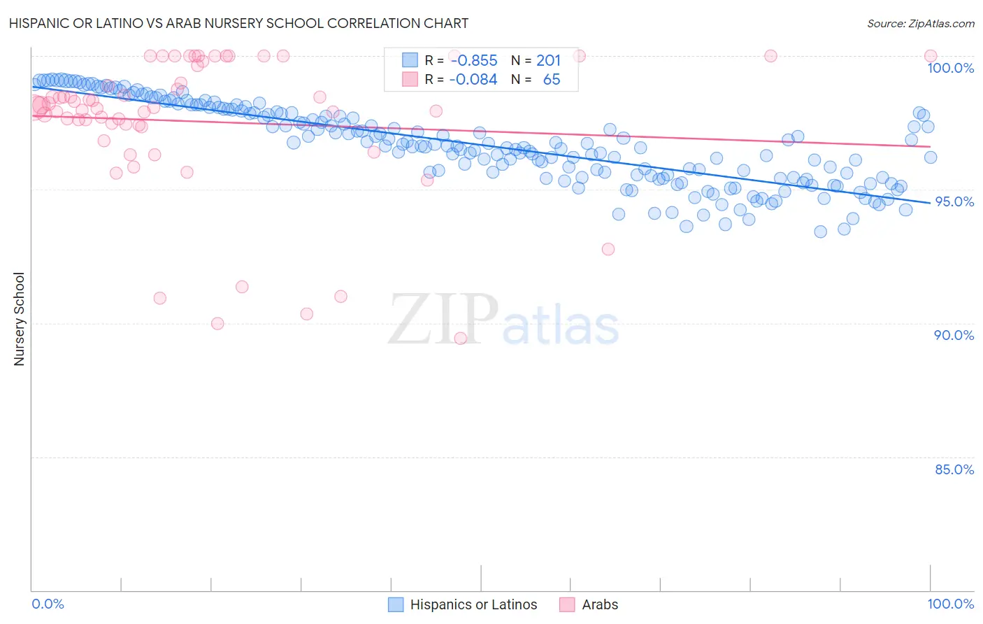 Hispanic or Latino vs Arab Nursery School Correlation Chart