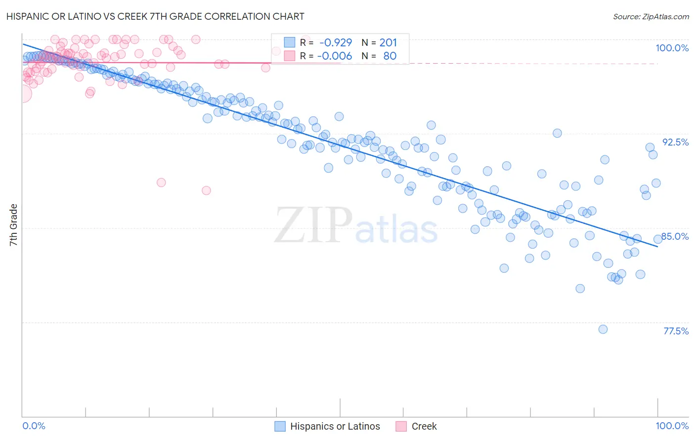 Hispanic or Latino vs Creek 7th Grade Correlation Chart