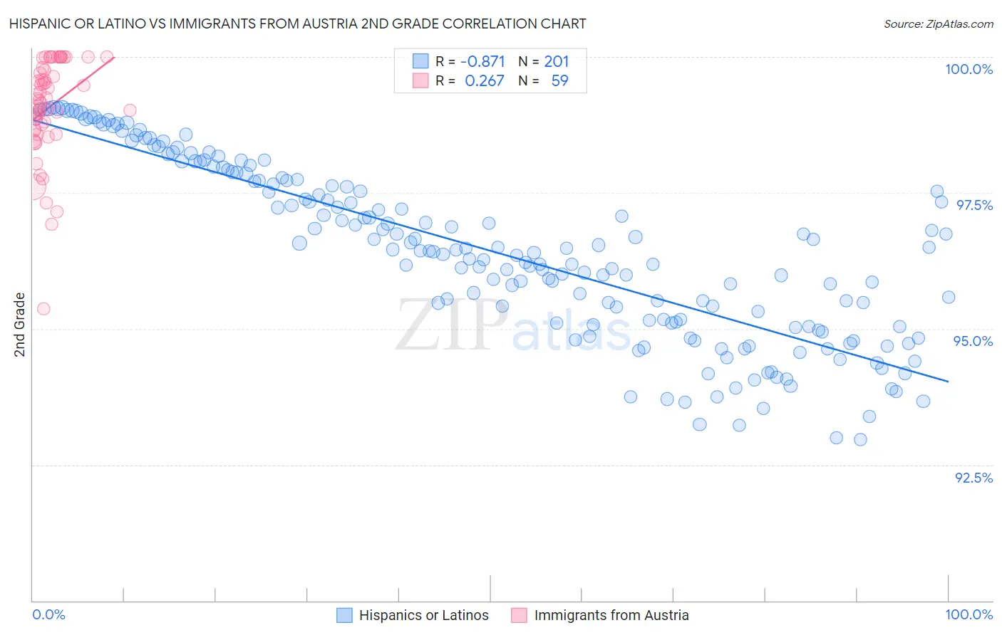 Hispanic or Latino vs Immigrants from Austria 2nd Grade Correlation Chart