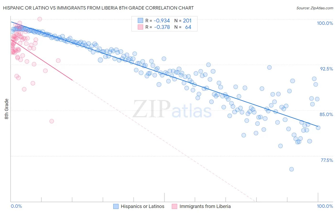 Hispanic or Latino vs Immigrants from Liberia 8th Grade Correlation Chart