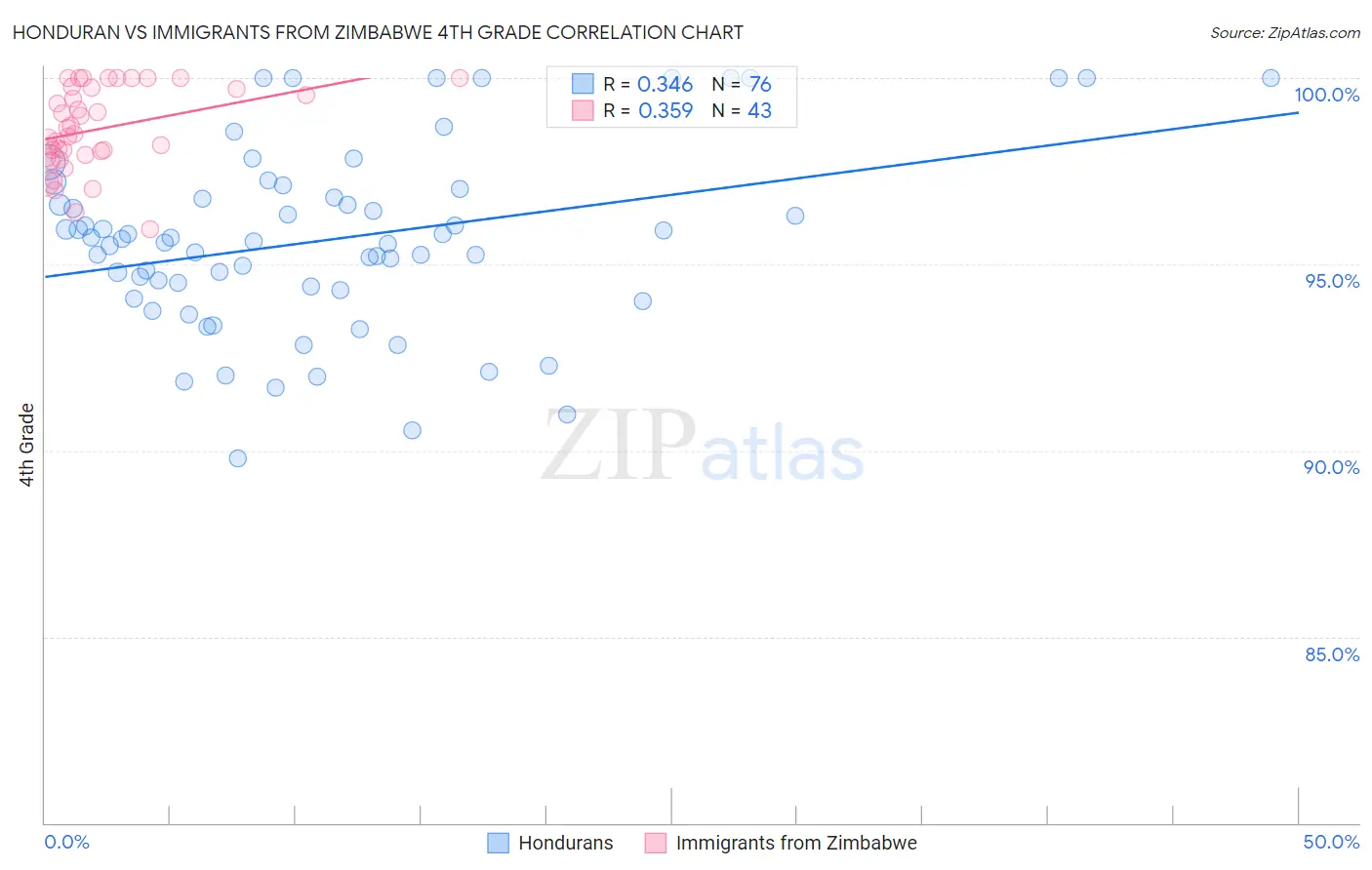 Honduran vs Immigrants from Zimbabwe 4th Grade Correlation Chart