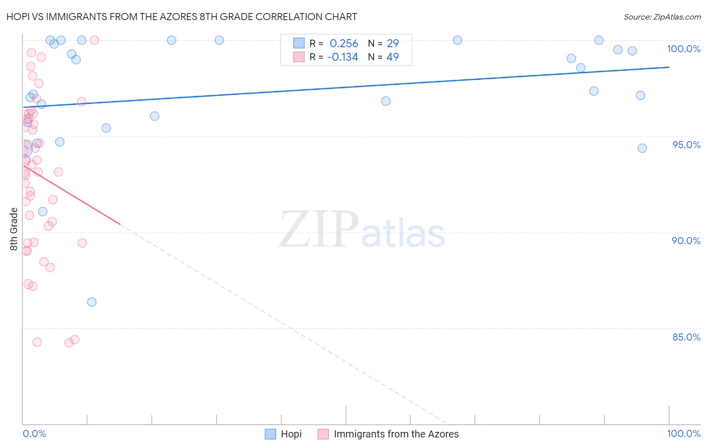 In terms of 8th grade, the demographic groups most similar to Hopi are Immigrants from Jordan (95.9%, a difference of 0.0%), Blackfeet (96.0%, a difference of 0.010%), French American Indian (96.0%, a difference of 0.010%), Immigrants from Israel (96.0%, a difference of 0.020%), and Immigrants from Russia (96.0%, a difference of 0.020%).