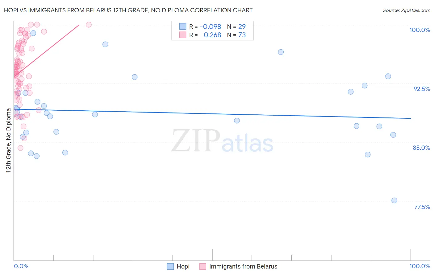 Hopi vs Immigrants from Belarus 12th Grade, No Diploma Correlation Chart