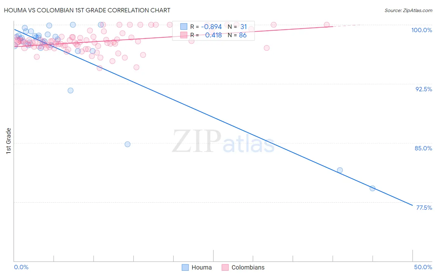 The statistical analysis conducted on geographies consisting of 36,795,916 people shows a very strong negative correlation between the proportion of Houma and percentage of population with at least 1st grade education in the United States with a correlation coefficient (R) of -0.894 and weighted average of 97.2%. Similarly, the statistical analysis conducted on geographies consisting of 419,700,680 people shows a moderate positive correlation between the proportion of Colombians and percentage of population with at least 1st grade education in the United States with a correlation coefficient (R) of 0.418 and weighted average of 97.6%, a difference of 0.41%.