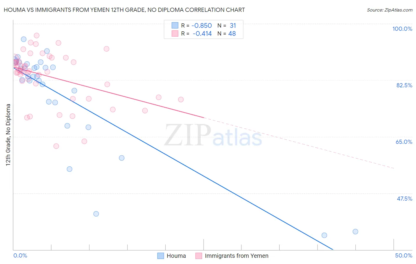 Houma vs Immigrants from Yemen 12th Grade, No Diploma Correlation Chart