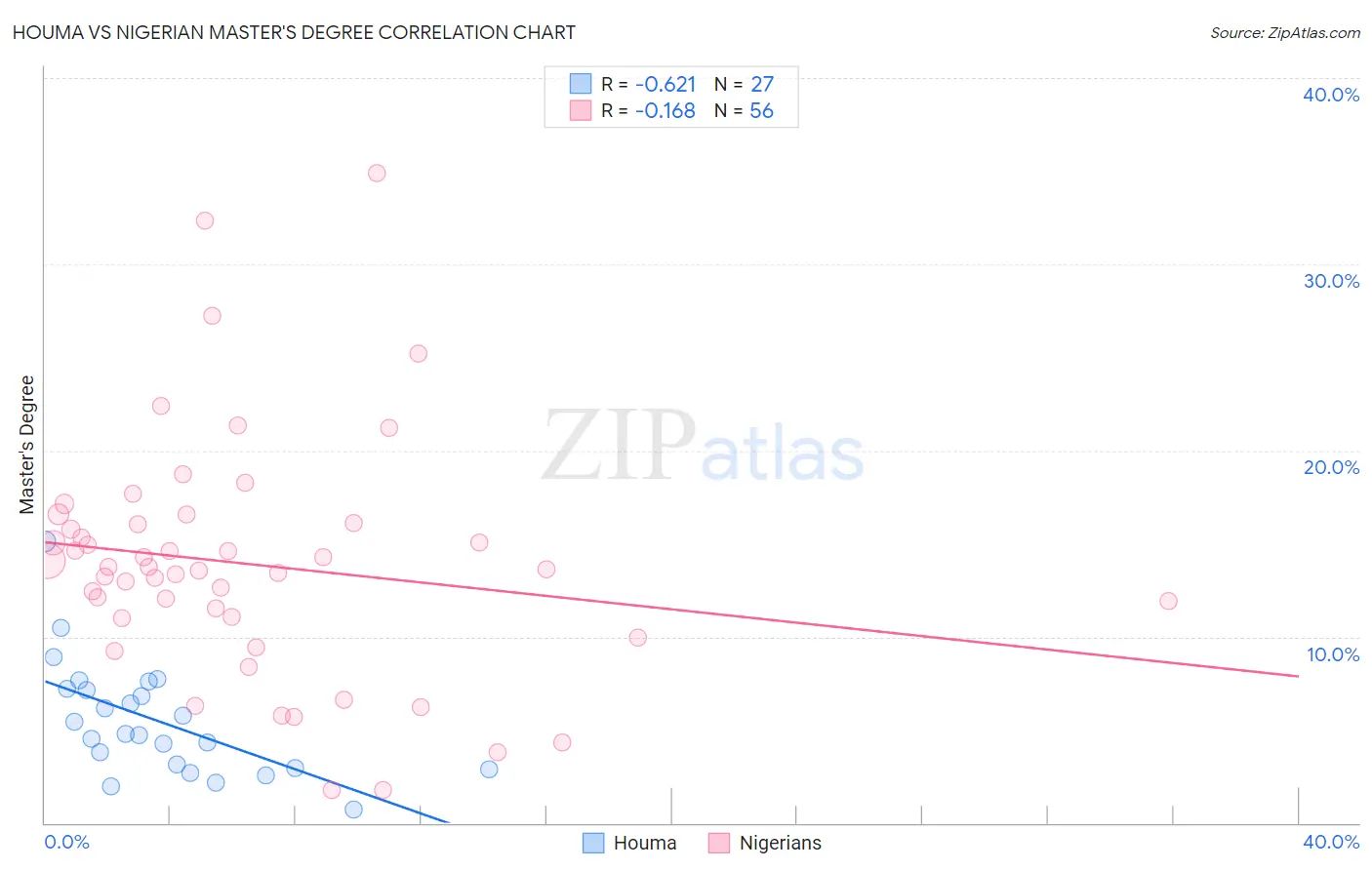 The statistical analysis conducted on geographies consisting of 36,787,451 people shows a significant negative correlation between the proportion of Houma and percentage of population with at least master's degree education in the United States with a correlation coefficient (R) of -0.621 and weighted average of 7.9%. Similarly, the statistical analysis conducted on geographies consisting of 332,630,518 people shows a poor negative correlation between the proportion of Nigerians and percentage of population with at least master's degree education in the United States with a correlation coefficient (R) of -0.168 and weighted average of 14.9%, a difference of 88.2%.