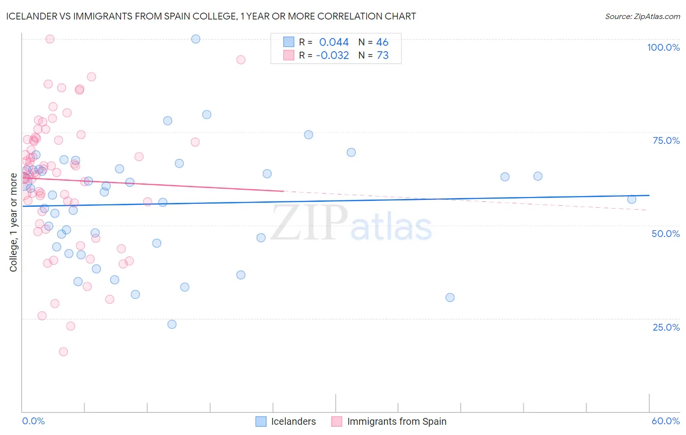Icelander vs Immigrants from Spain College, 1 year or more Correlation Chart