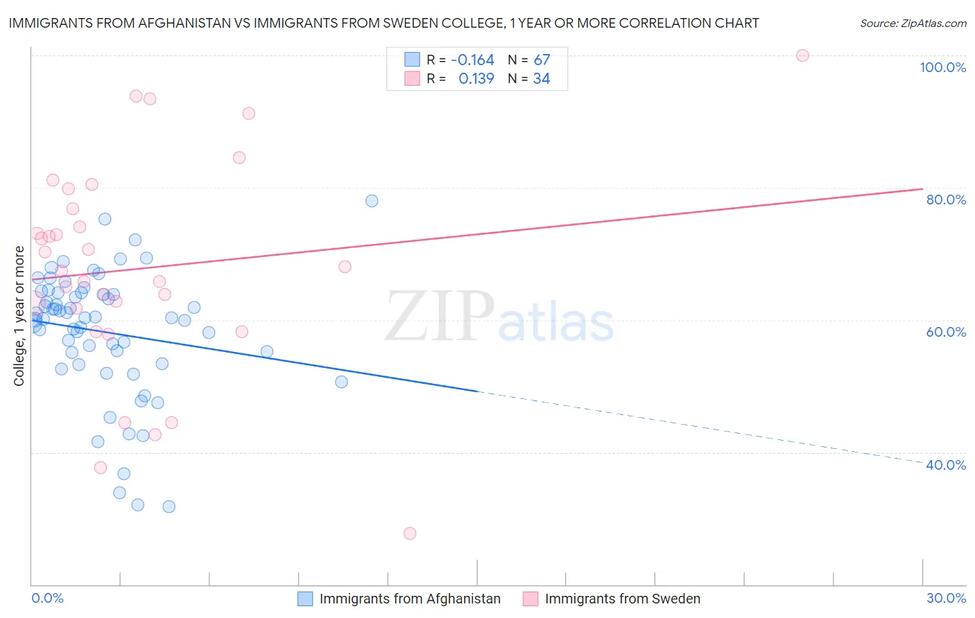 Immigrants from Afghanistan vs Immigrants from Sweden College, 1 year or more Correlation Chart