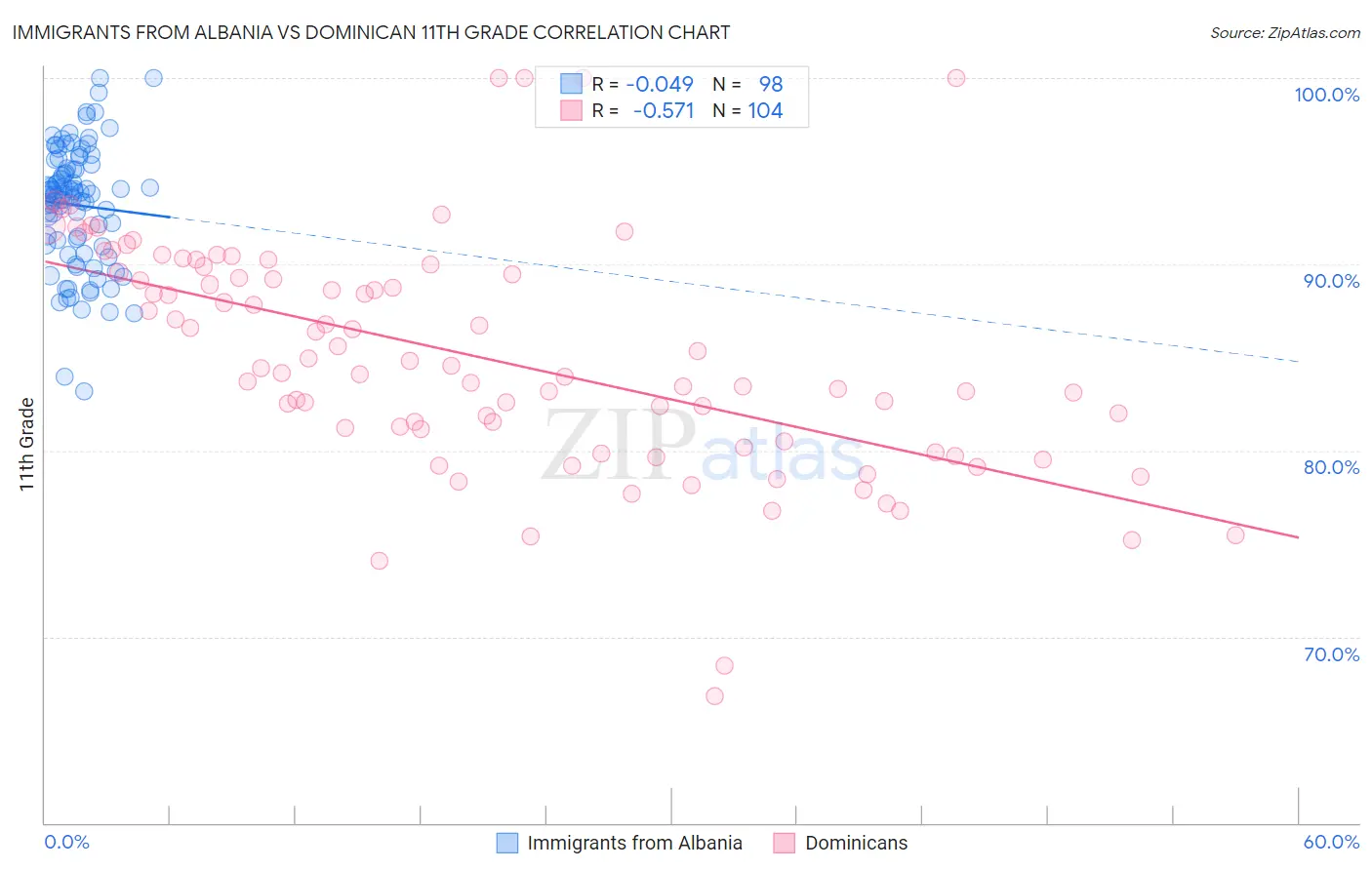 Immigrants from Albania vs Dominican 11th Grade Correlation Chart